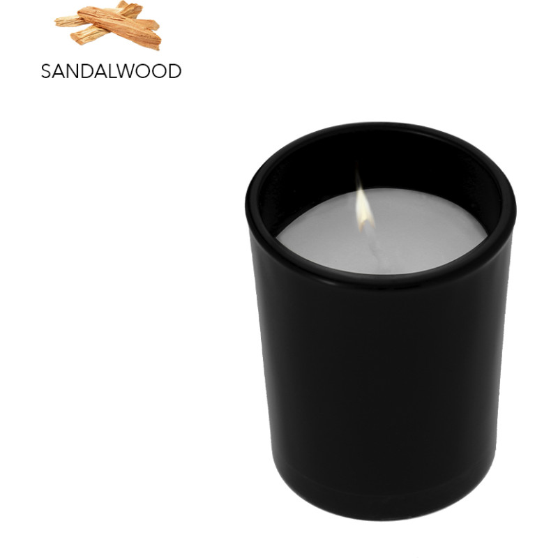 Scented candle in glass. Available in various fragrances: - White color: vanilla fragrance. - Black color: sandalwood aroma.