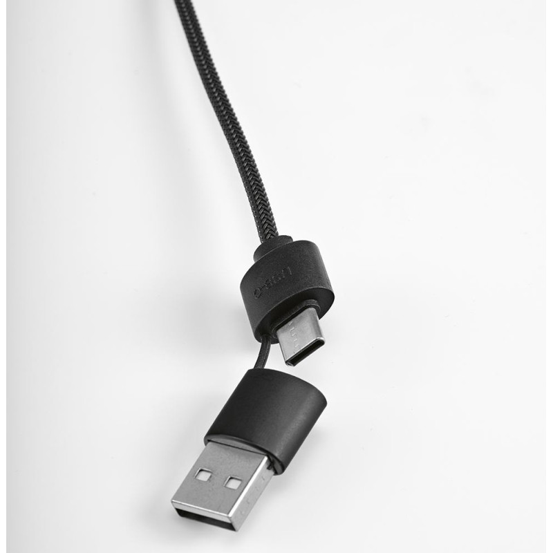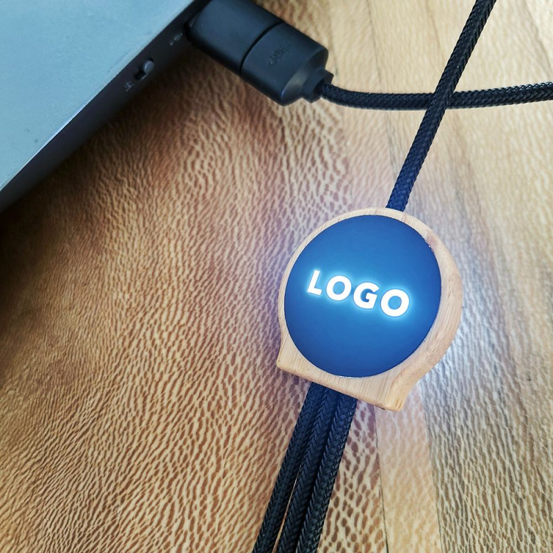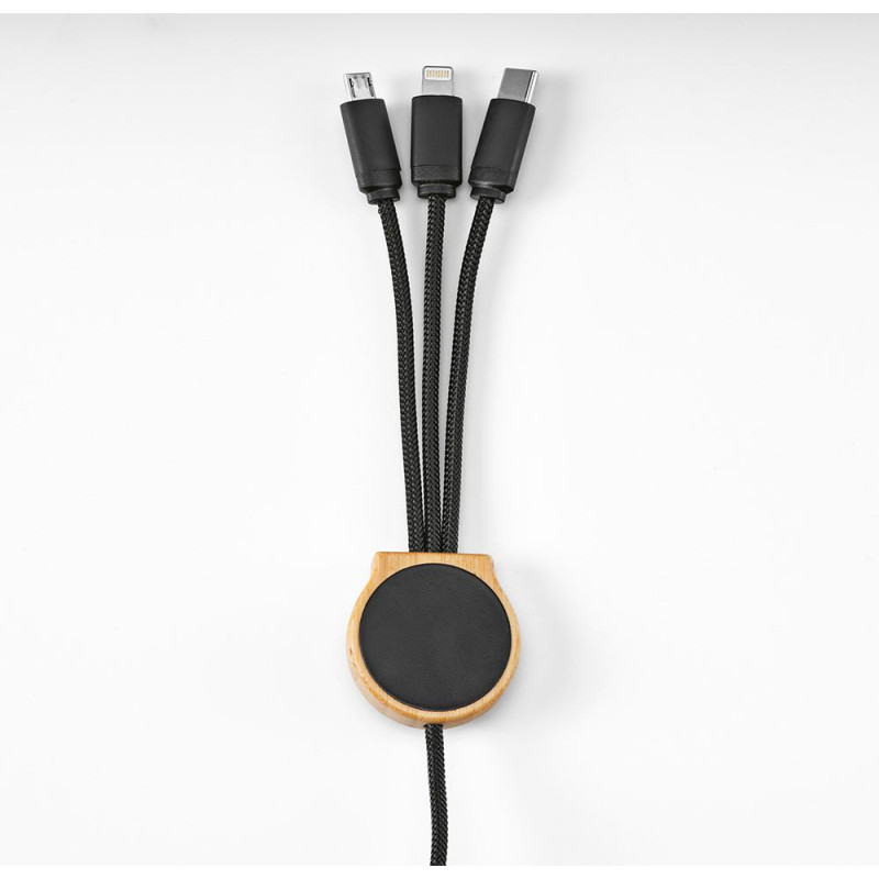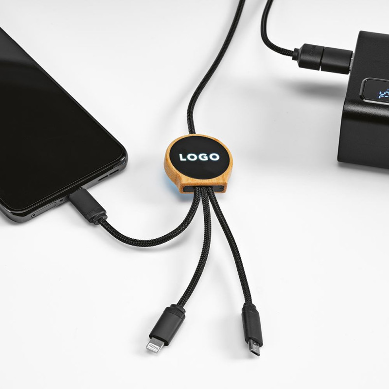 Asimov 5-in-1 fast charging multi cable in rPET and bamboo. This innovative 5-in-1 fast charger (5V2.4A) features connectors for USB-A, USB-C, Micro-USB and Lightning, It's a versatile companion. The logo becomes backlit once personalized. Packed inside and individual kraft pouch.