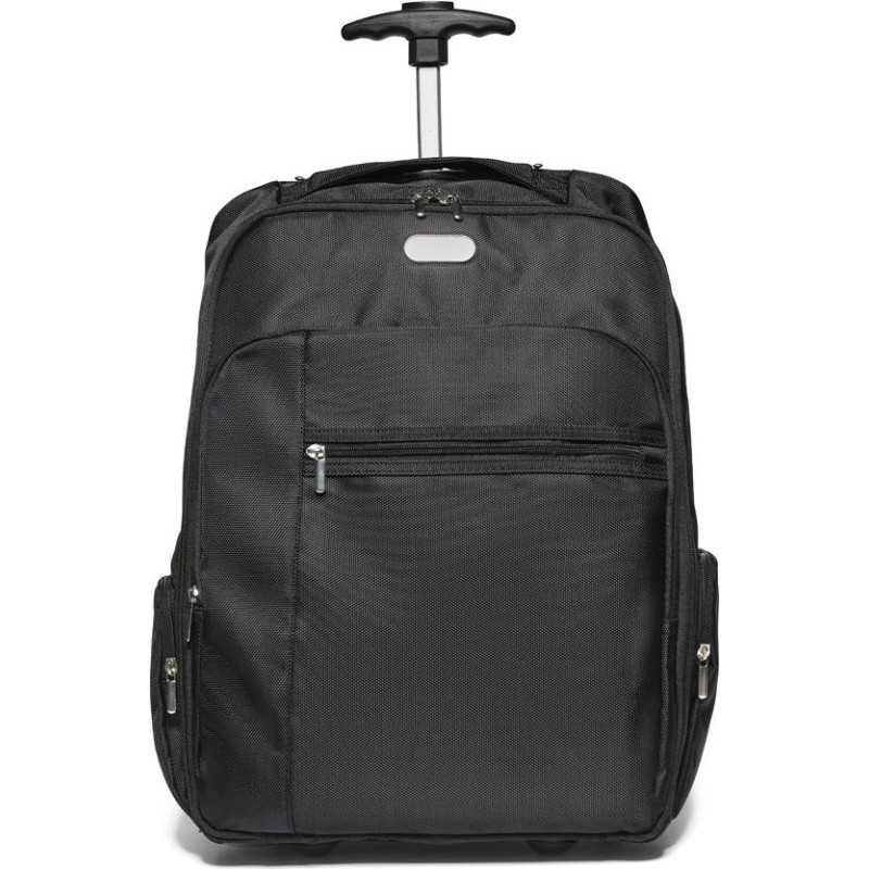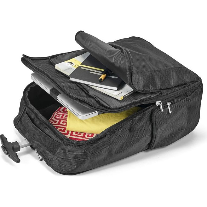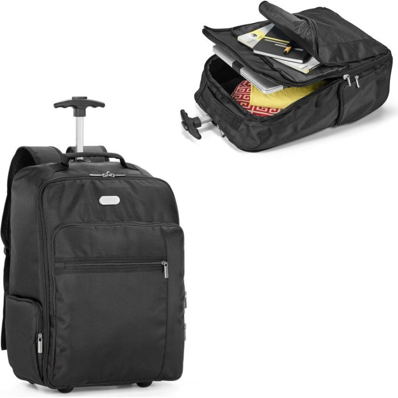 Laptop trolley backpack in 1680D and 300D. It's main compartment is padded and cuchioned has a divider for a laptop up to 17''. It contains 2 front pockets and 2 zippered side pockets. This trolley has a wheel protector, padded handles, extendable metal spring grip and includes a removable magnetic metal plate for easy customization. It has capacity up to 28 L and weighs 1'80 kg. Metal plate custamisable with laser supplied seperately. 330 x 490 x 220 mm | Plate: 50 x 20 mm