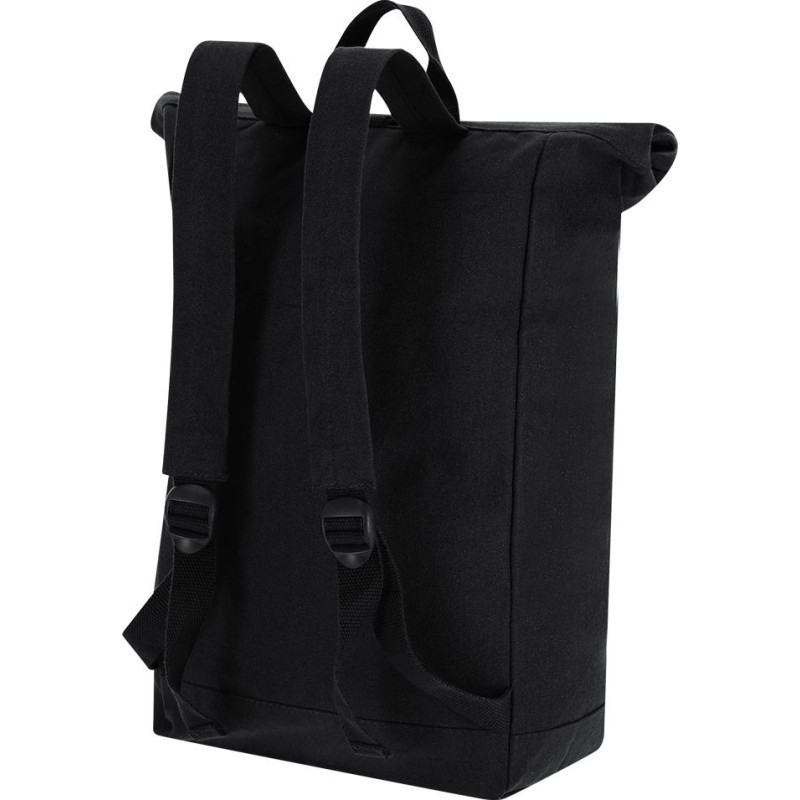Backpack made of recycled canvas material. High capacity main compartment. with security buckle and velcro closure, plus a front pocket with invisible zip closure. Quick access pocket on the side and top handle, adjustable shoulder straps, and outside label with Recycled Cotton logo.