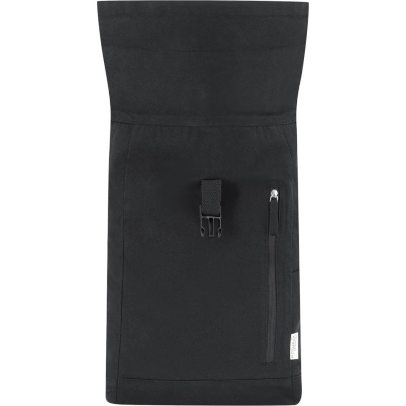 Backpack made of recycled canvas material. High capacity main compartment. with security buckle and velcro closure, plus a front pocket with invisible zip closure. Quick access pocket on the side and top handle, adjustable shoulder straps, and outside label with Recycled Cotton logo.
