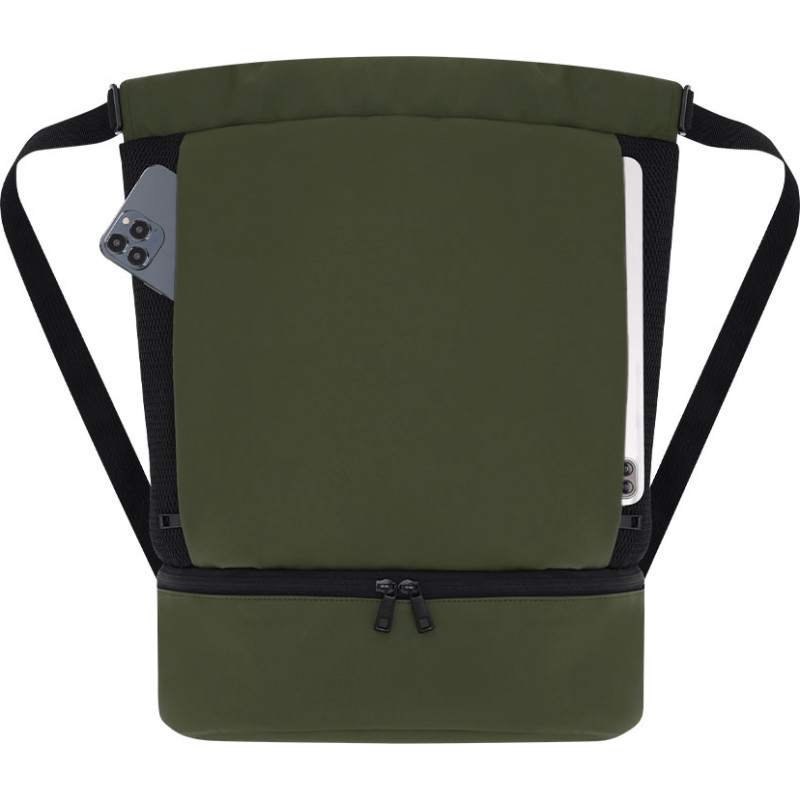 Backpack made from soft PU with a main compartment with a drawstring closure and a small interior pocket with zipper closure. Includes a shoe pocket at the base with double zipper closure and front pockets with quick-access zipper closures. With breathable sides and adjustable shoulder straps.