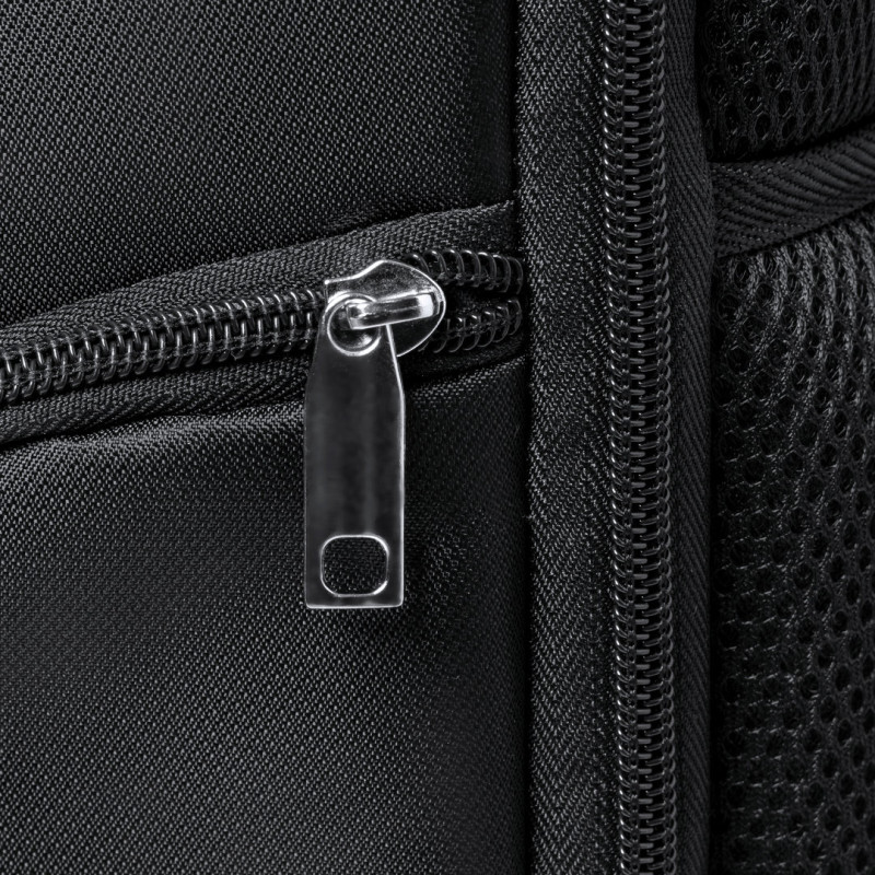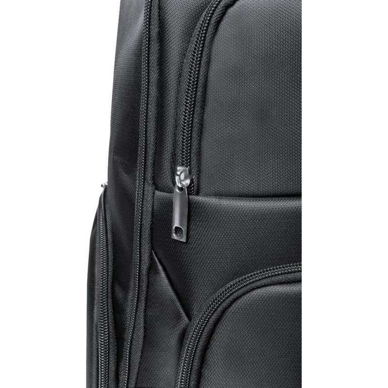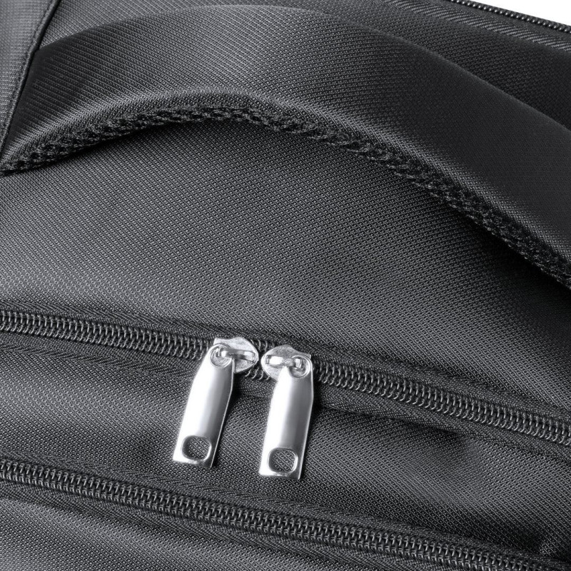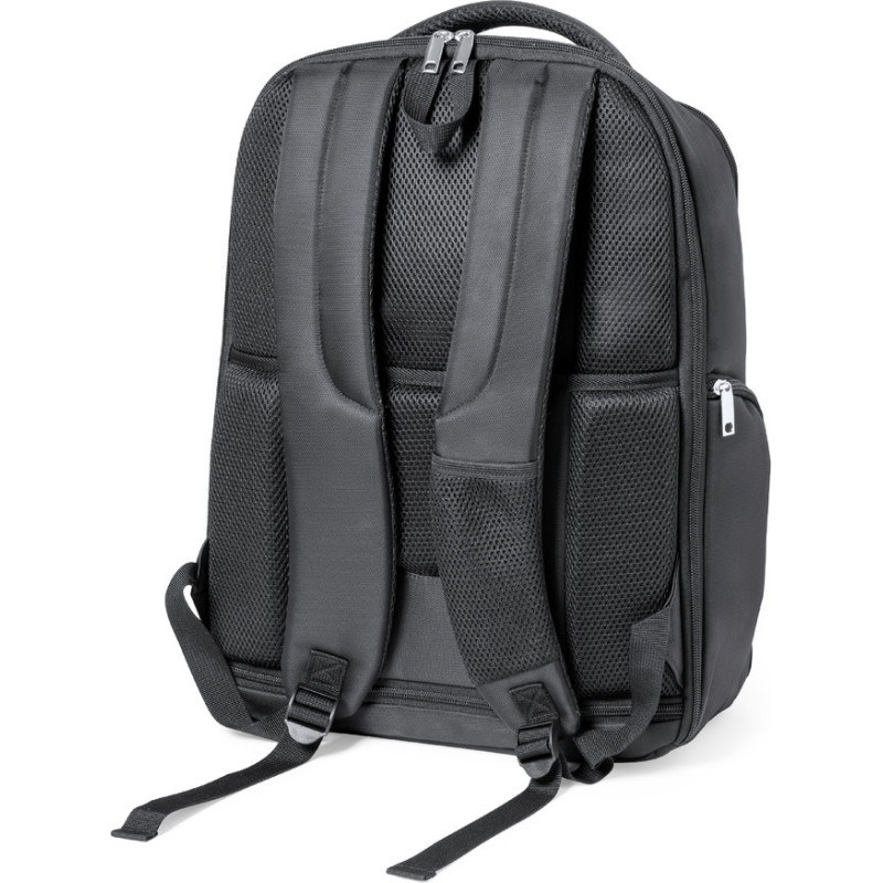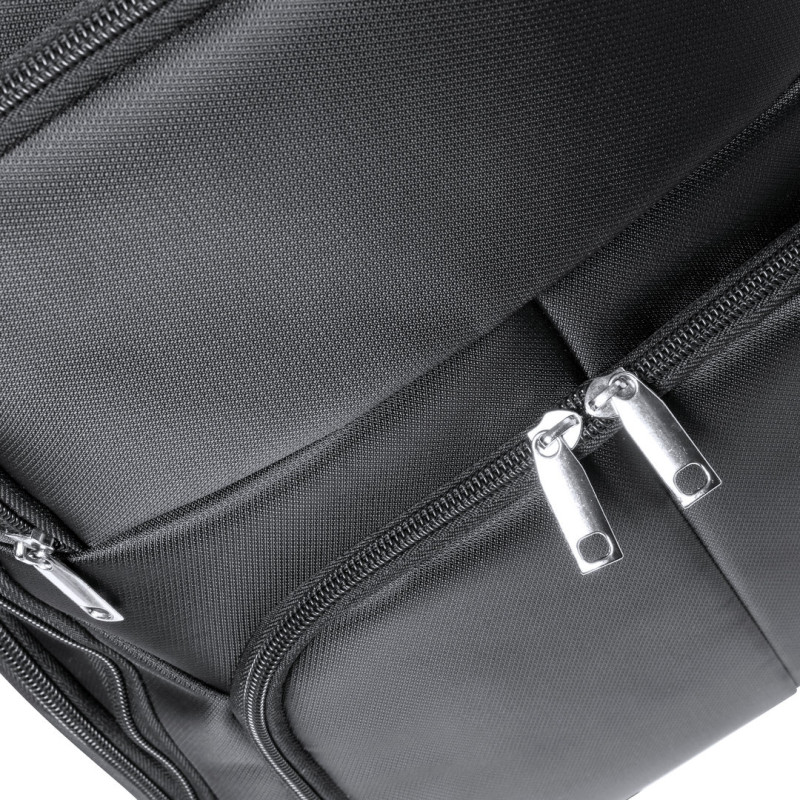 Premium quality backpack made of durable 600D Nyon fabric with black finish. Main compartment with matching zip closure and double puller. 3 outside pockets and 2 side pockets, all zippered. Padding on handle, back and shoulder straps, the latter adjustable. Inside with padded compartments for laptops up to 17 inches and tablets up to 12 inches. Backside attachment for trolley fitting.