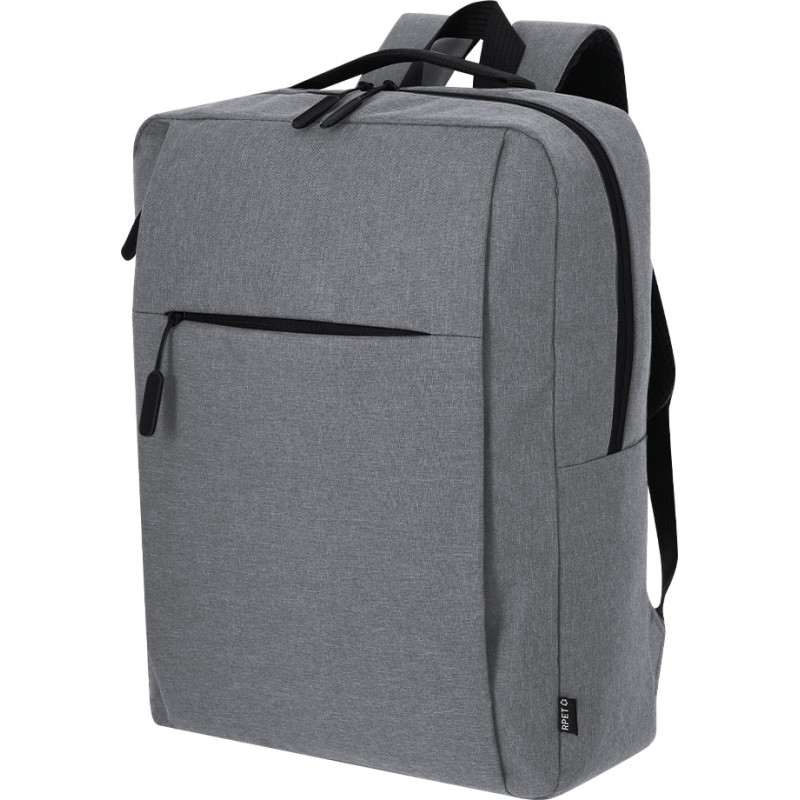 Backpack made from soft RPET 600D polyester. With a main pocket with double pull zipper closure. Interior pocket for laptops up to 15 inches. Includes two front pockets with invisible zipper closures and side pockets. Padded adjustable back and straps. Includes strap for trolley or suitcase adjustment, ideal for travel. With RPET label on the tag. The RPET material is made from recycled plastic, promoting the reuse of plastic waste and helping the planet's sustainability.