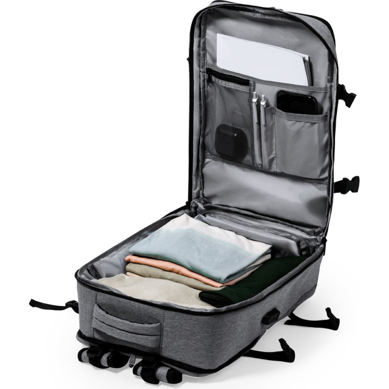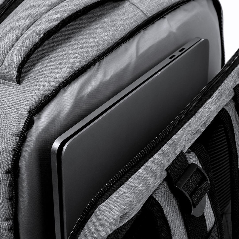 Multifunctional backpack made of 300D RPET. Made from recycled and water resistant polyester, with excellent breathability in the back area, facilitating heat dissipation thanks to its padded straps and padded back. The wide shoulder straps are designed to relieve pressure on the shoulders, enabling the backpack to be worn comfortably for long periods of time.Perfect for any situation, and with multiple compartments: 2 front pockets. 3 large central compartments, one of which is a large compartment, a large central pocket for storing clothes and/or accessories with an organiser inside, and a third padded pocket, perfect for carrying a laptop up to 17.3 inches. It also has 3 special compartments, a side pocket perfect for quick access, a shoe pocket on the bottom with ventilation eyelets, and an anti-theft pocket on the back, plus USB cable. Perfect for travel or everyday use with adjustable straps to suit all lifestyles. Available in black and grey, with RPET label included. Presented individually in a recycled bag.