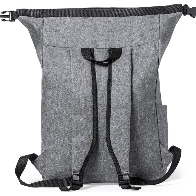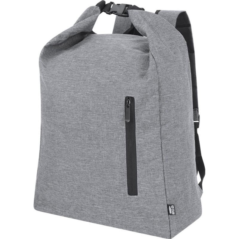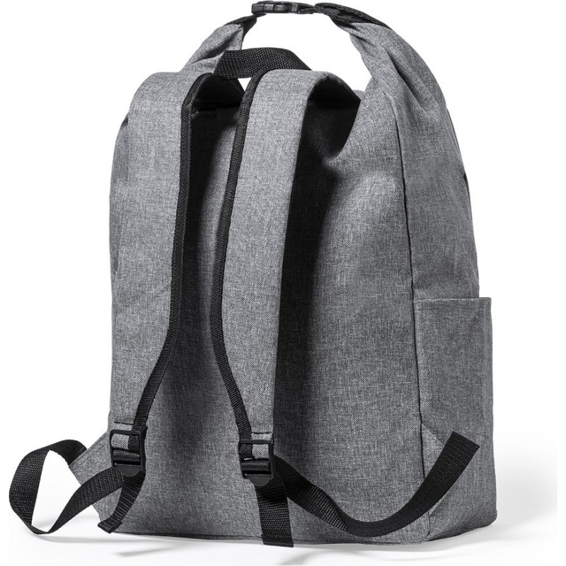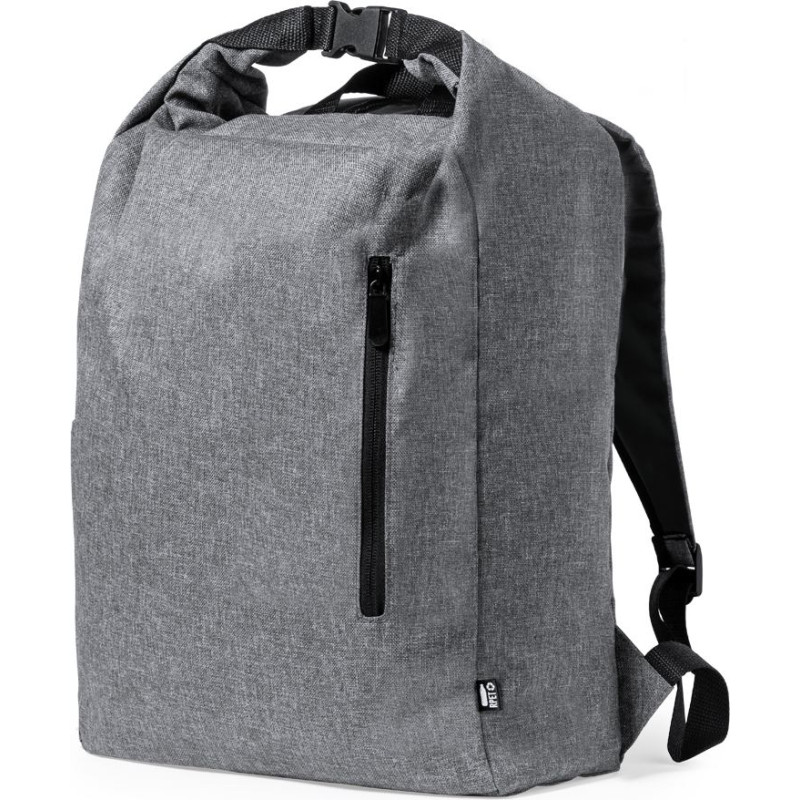 Nature line backpack made of durable 300D RPET, made from recycled plastic, to encourage the reuse of plastic waste and contribute to the sustainability of the planet. Main pocket with buckle closure and side pocket. Adjustable padded shoulder straps and RPET emblem on outside label.