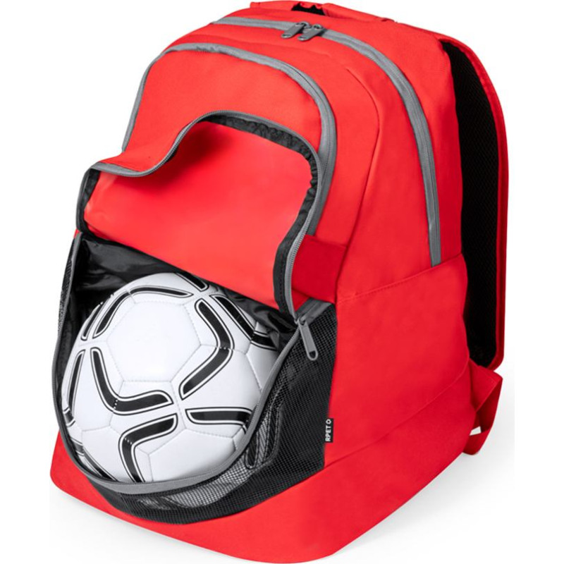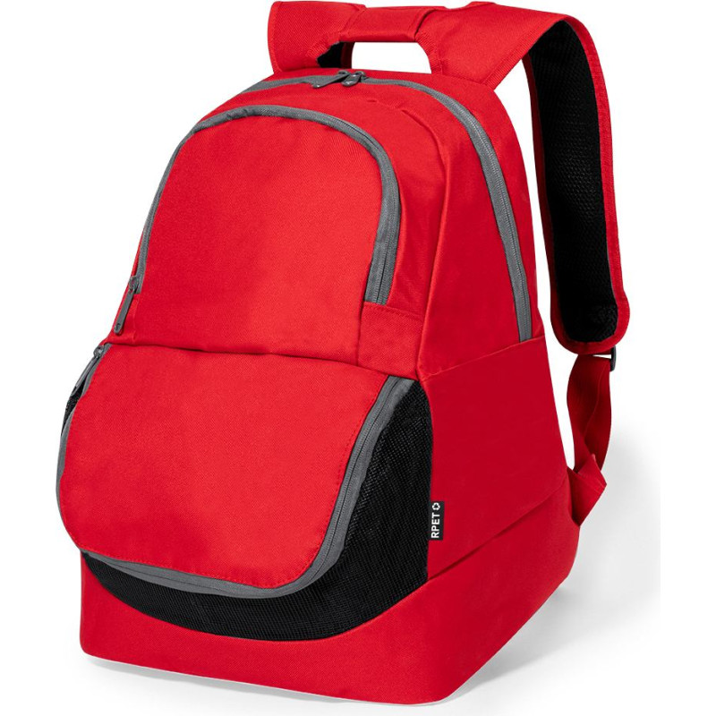 Practical backpack made of 600D RPET polyester. It has padded handles for easy carrying, as well as three different pockets for optimal storage: a large capacity main pocket with double zip closure; a quick access front pocket with zip closure; and a zipped pocket with mesh, ideal for shoes or balls, providing breathability. Available in a wide range of colours, with grey zips.RPET material is made from recycled plastic, thus promoting the reuse of plastic waste and helping the sustainability of the planet.