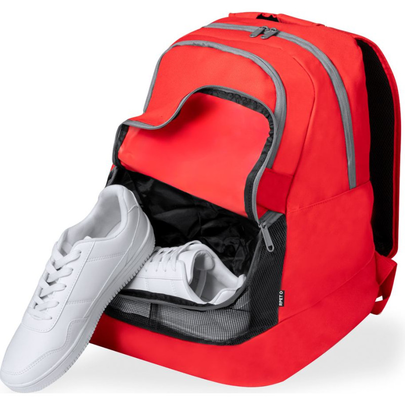 Practical backpack made of 600D RPET polyester. It has padded handles for easy carrying, as well as three different pockets for optimal storage: a large capacity main pocket with double zip closure; a quick access front pocket with zip closure; and a zipped pocket with mesh, ideal for shoes or balls, providing breathability. Available in a wide range of colours, with grey zips.RPET material is made from recycled plastic, thus promoting the reuse of plastic waste and helping the sustainability of the planet.