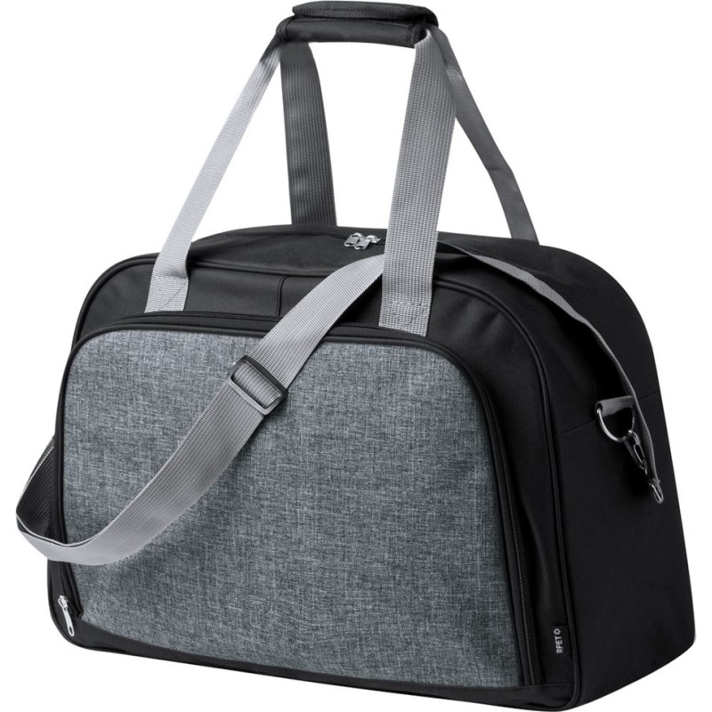 Large capacity bag made of durable 600D RPET. Including 2 resistant handles with a velcro closure pad for comfort. Front pocket with zippered closure and an adjustable shoulder strap. Available in a variety of colours, including a RPET label. Presented in an individual recycled bag.RPET material is made from recycled plastic, thus promoting the reuse of plastic waste and helping the sustainability of the planet.