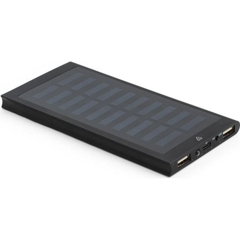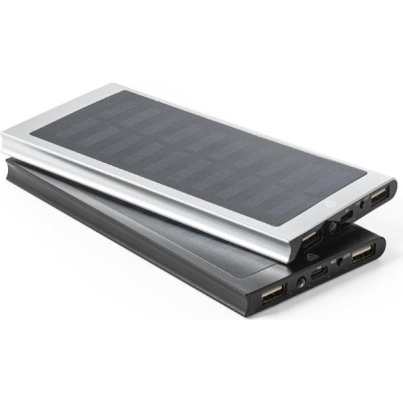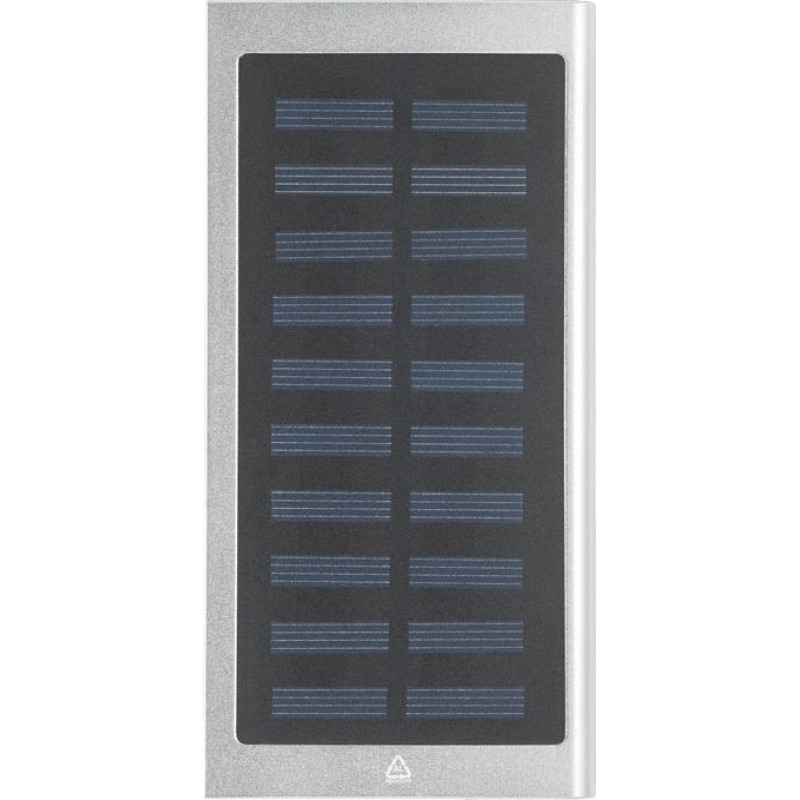 Power bank with solar panel, torch and charge level indicator. Ideal for emergency situations, both for its ability to charge the battery using sunlight and for its built-in LED torch.Material: recycled aluminium (100% rAL) | Capacity: 8.000 mAh | Charging power: | Input: USB-C | Outputs: 2x USB-A | Includes: USB-C charging cable | Supplied: gift box made from recycled kraft paper 10 x 153 x 74 mm