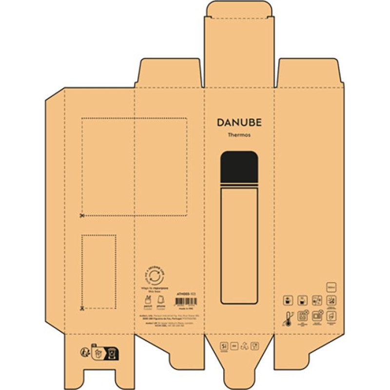 Danube 500ml thermos made from recycled stainless steel. The double-wall vacuum insulation keeps drinks at their best (20 hours hot and 55 hours cold), whether during a hike or at the office. Includes a cup (9.9cl). Available in 7 colours and in an individual kraft box.
