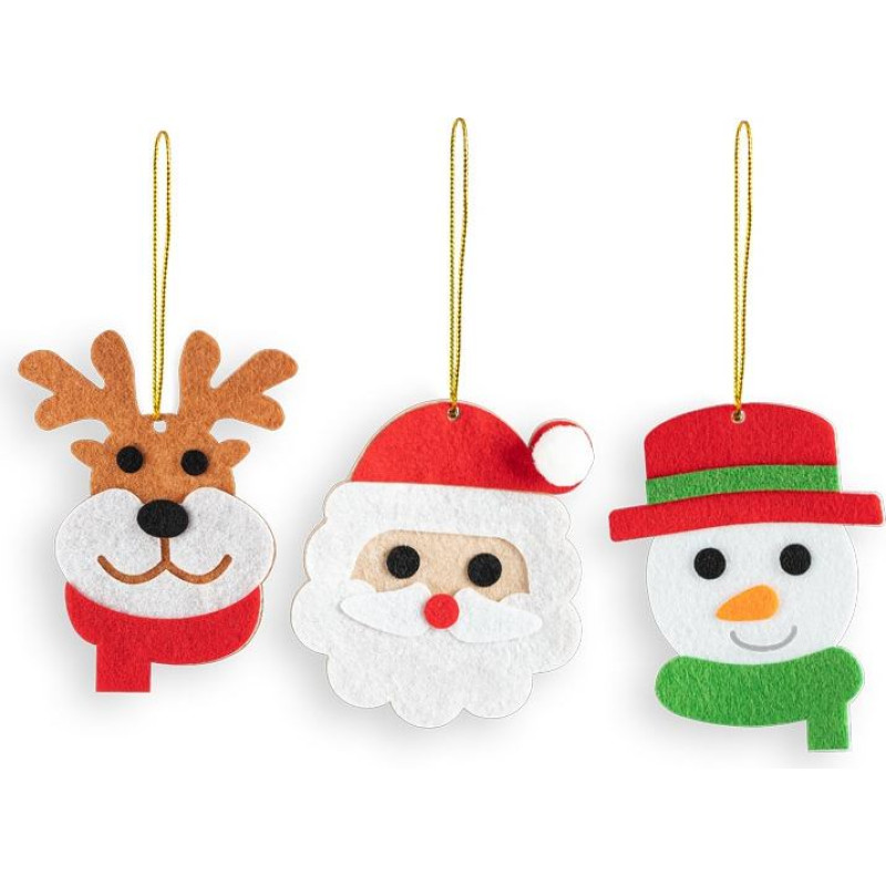 Set of 3 felt Christmas ornaments with different designs. santa 73.6x82x1 mm, sněhulák 70x87.2x1 mm, sob 70.7x90x1 mm