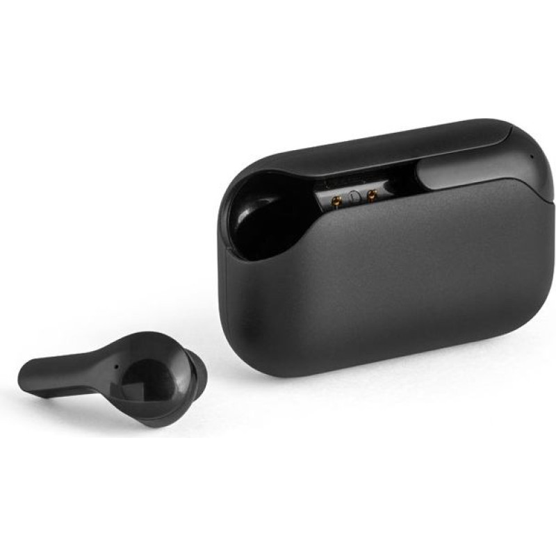 Water-resistant earphones with built-in microphone. It has a charging case with LED indicator to show the charge level and touch control for a more pleasant and efficient experience.Material: ABSWireless transmission: BT V5'0IPX4Capacity: 800 mAhFunctionalities: hands-free calling and playlist control from mobile deviceIncludes: charging cable USB-CSupply: gift box 69 x 42 x 25 mm
