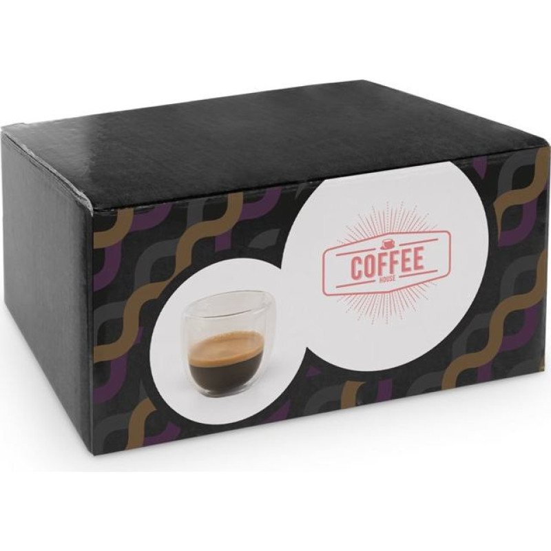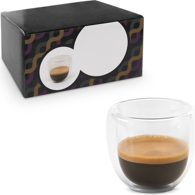 Set with 2 borosilicate glass cups with air-insulated double body. The cups have capacity up to 75 mL. Supplied in a customisable gift box. Box: 133 x 65 x 65 mm