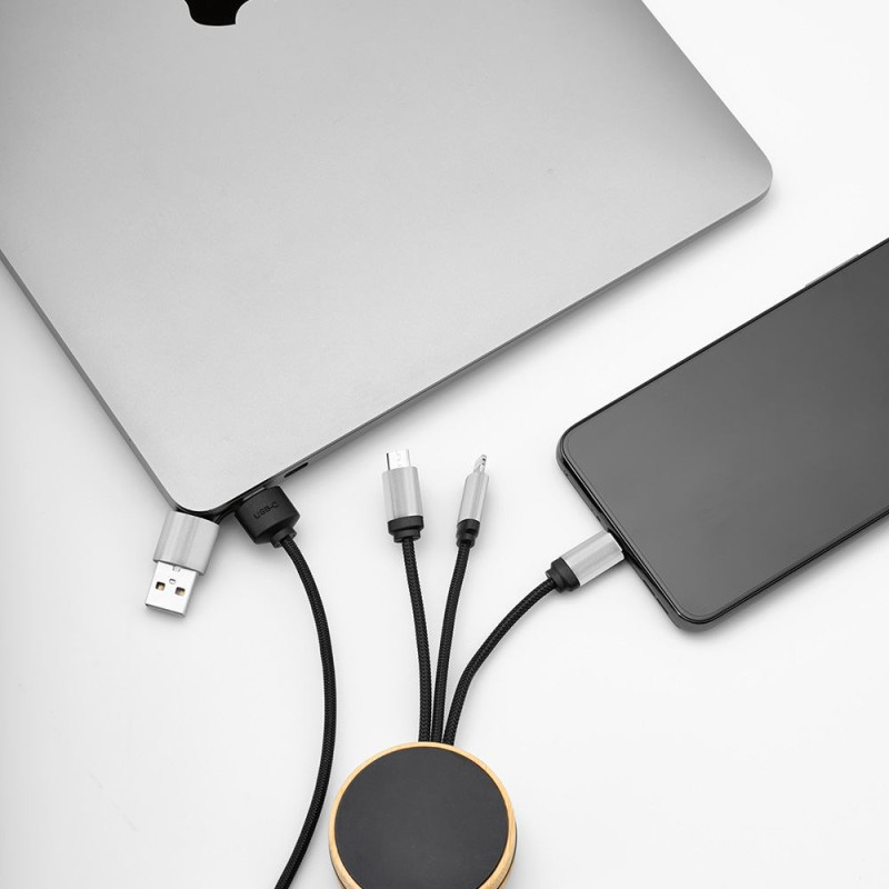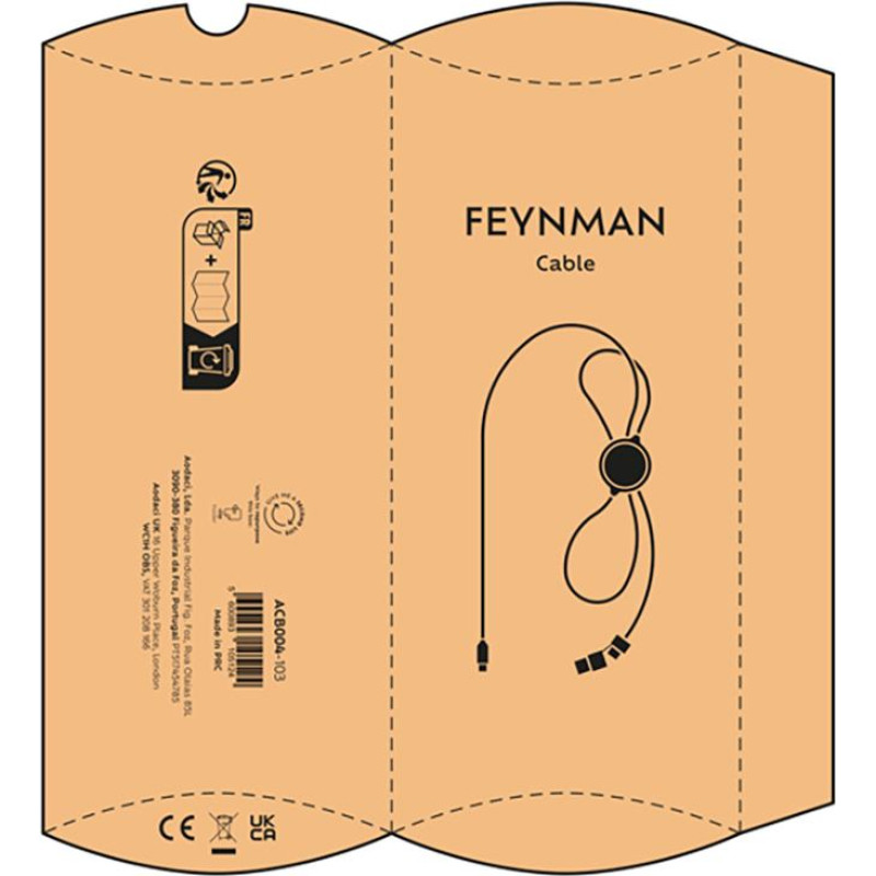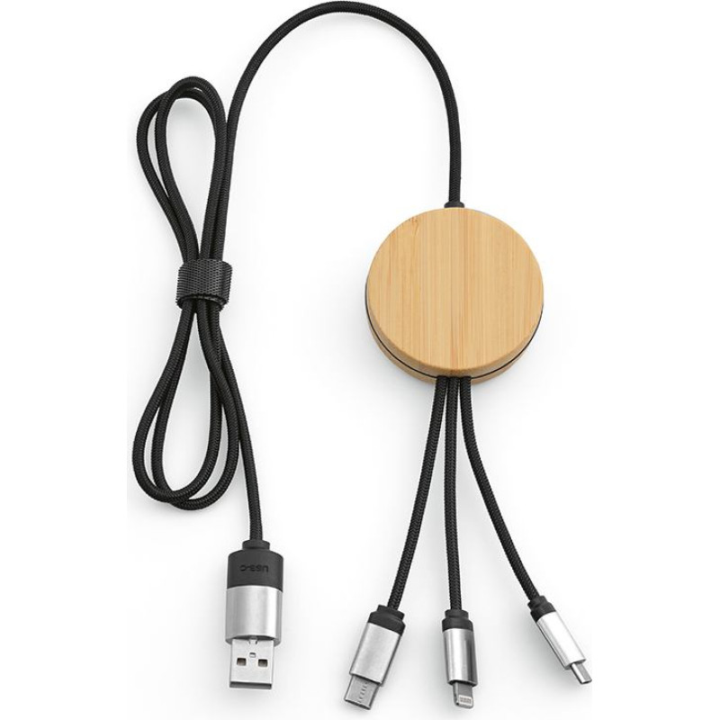 Feynman 5-in-1 multi cable, 1 meter charging cable with a body intricately crafted from bamboo and rPET. Featuring USB-A or USB-C to USB-C, Micro USB, Lightning and Wireless Charging (15W). Use connectors or wireless surface to connect devices. Elevate your tech experience while fast charging. The logo becomes backlit once personalized with laser. Packed inside and individual kraft pouch.