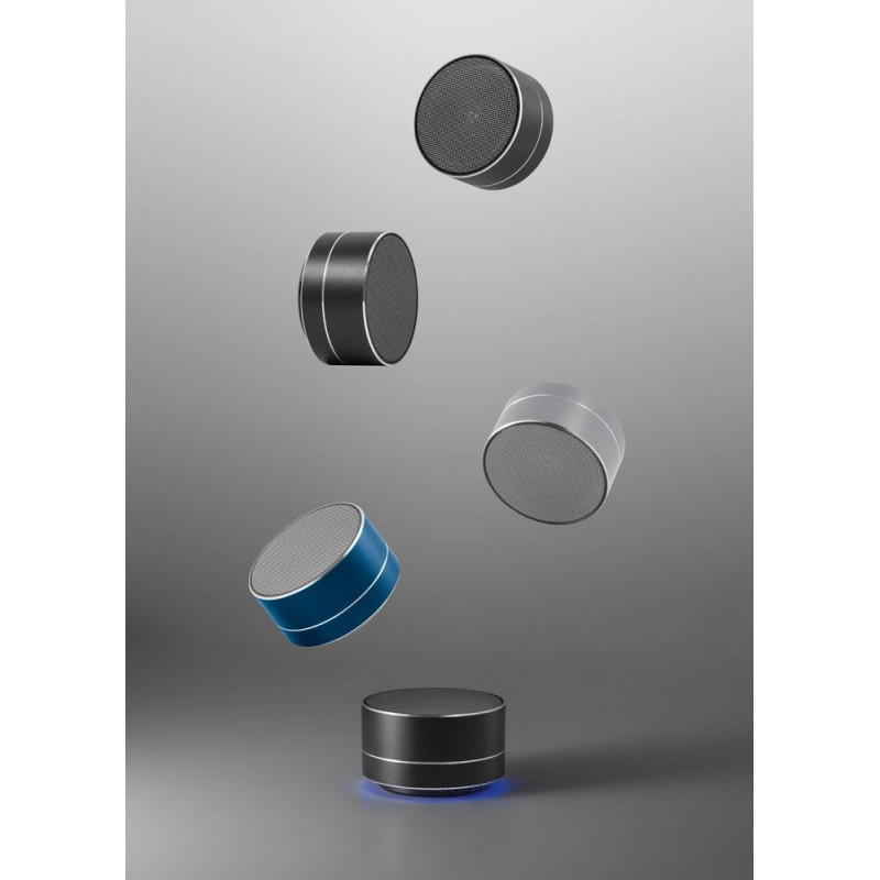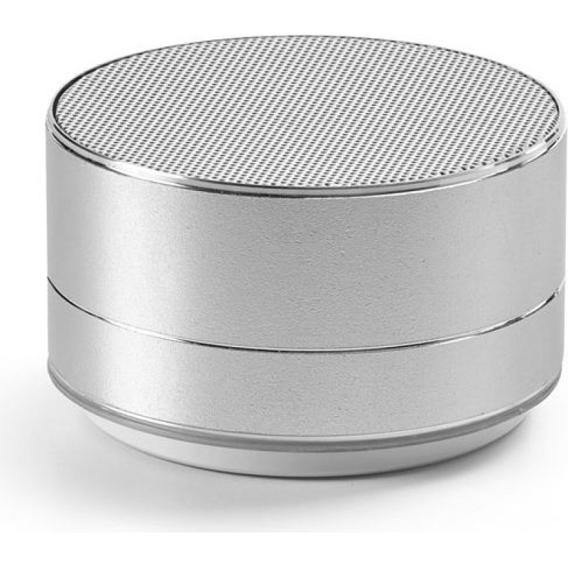 Portable speaker made from recycled aluminium (100% rAL) and recycled ABS (100% rABS). With BT v5'0 wireless transmission and micro SD card reader. With 3W of sound power and a 400 mAh battery, it has an autonomy of approximately 3 hours. It allows you to answer calls thanks to its built-in microphone, control the volume and playlist of your mobile device. Includes a USB-C charging cable. Supplied in a recycled kraft paper gift box, which can be reused as a smartphone holder. If no personalisation is chosen, the grille is supplied loose inside the gift box. Once attached to the speaker, the grid cannot be removed again. ø71 x 42 mm | Box: 80 x 80 x 60 mm