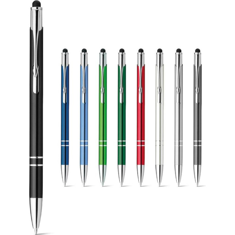 Aluminium ball pen with touch tip and clip. Blue ink. ø8 x 142 mm