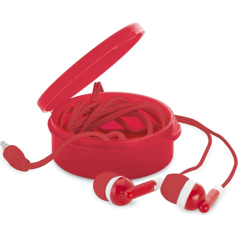 Earphones with 1'2 metre cable and 3'5 mm stereo connection in ABS. Supplied in a PP box. Box: ø55 x 20 mm