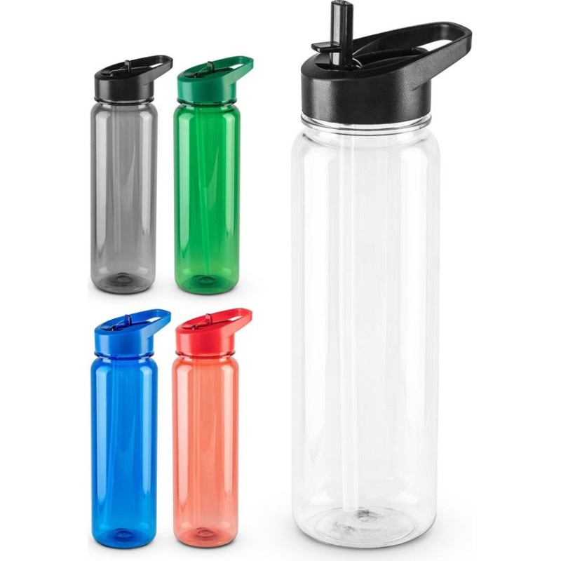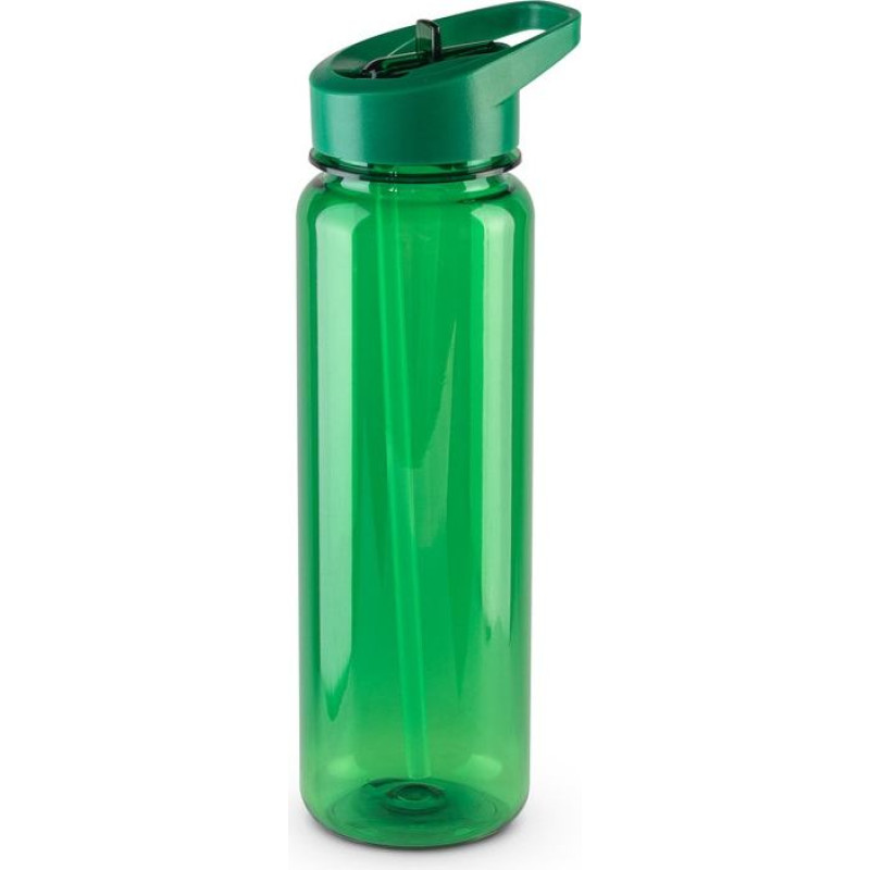 Sports bottle in recycled PET (100% rPET), with a translucent glossy finish. Lid with drinking fountain and internal straw. Capacity up to 750 mL. ø70 x 245 mm