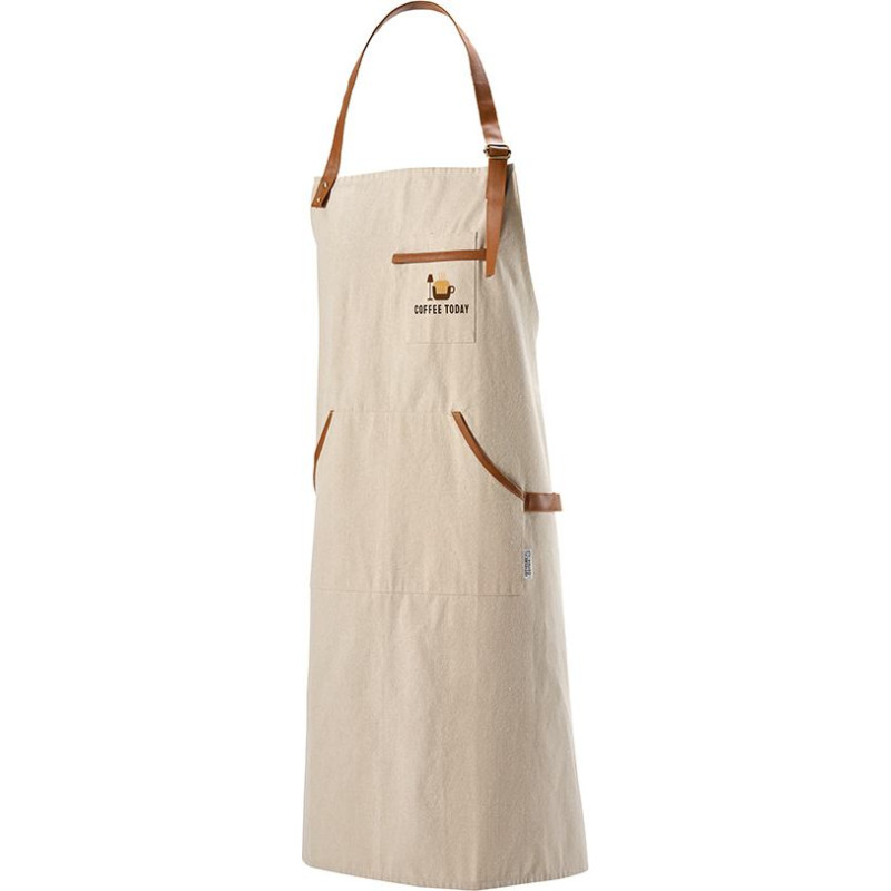 Goya Apron made from 300gsm recycled cotton (70%) and rPET (30%) with details in recycled PU. Its two roomy frontal pockets and handy top pocket keep your recipes close. Measuring 80x100cm and packed in a sustainable kraft box.