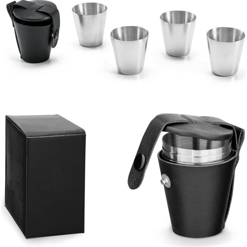 Set with 4 stainless steel cups in an PU carrying pouch. Cup capacity is 25 mL. Supplied in a gift box. ø44 x 62 mm | Box: 45 x 66 x 45 mm