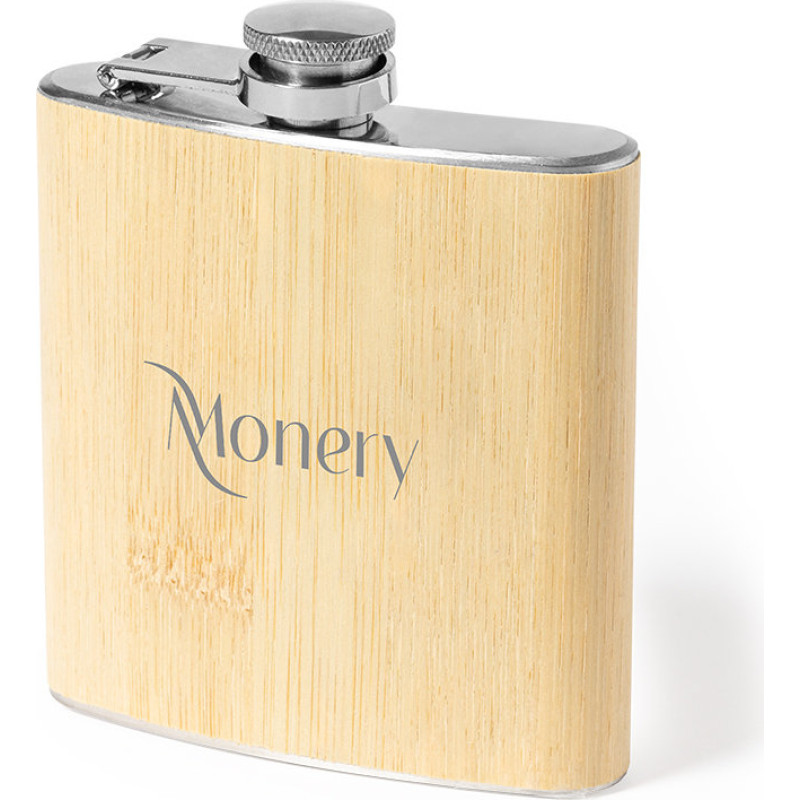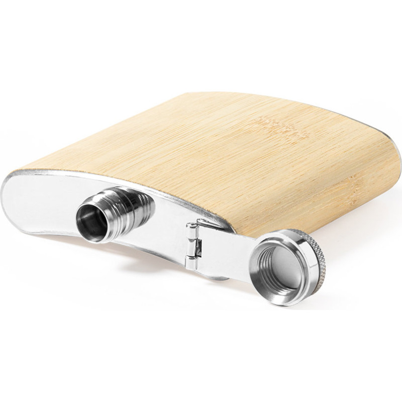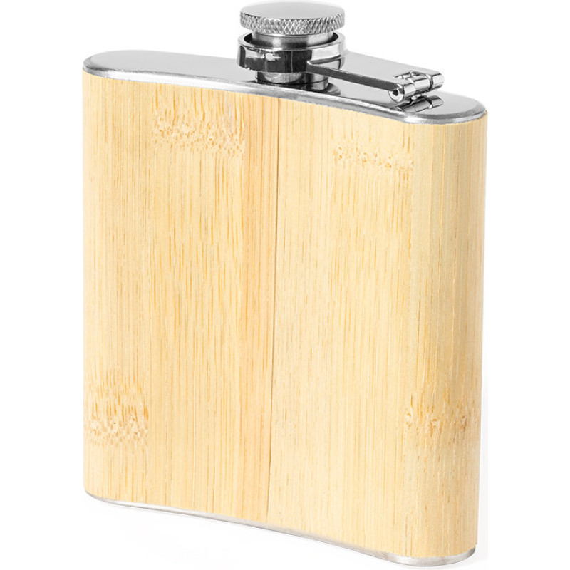 Flask in nature line and 170 ml capacity. Outside in bamboo with soft finish, stainless steel body and safety screw cap. Ergonomically designed to fit comfortably in your pocket. Presented in an individual box of eco design in kraft cardboard.