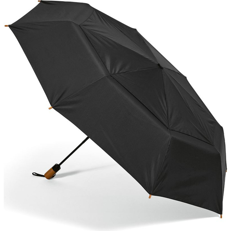 Jackson 27'' rPET foldable umbrella. With automatic opening and closing it is very easy to carry around. Crafted with a storm-proof fibreglass frame, wood handle and recycled aluminium shaft. Supplied in a rPET individual pouch.
