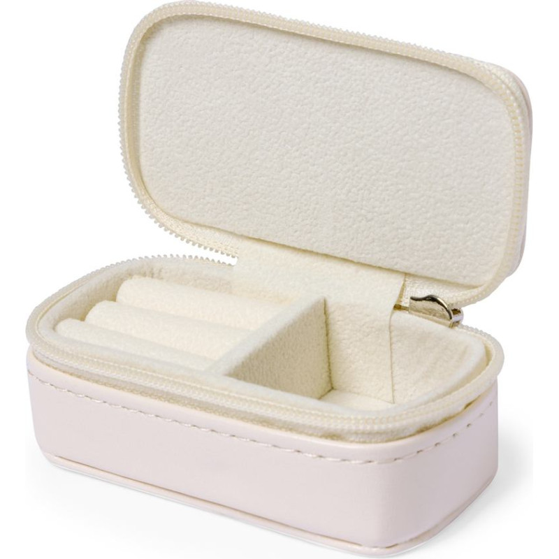 Jewellery box made of PU leather. Natural colour design with zip closure and two compartments inside. One compartment in the shape of a box and another compartment with pads for rings and earrings, lined with soft fabric. Presented in an individual paper bag.