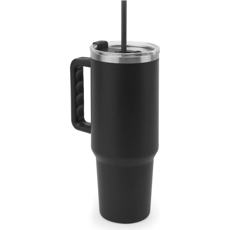 Large travel cup to keep you hydrated throughout the day without the need for constant refills. Made from stainless steel (91% rSS), it has a vacuum-insulated double wall and a matt finish. This cup can be used in two ways: through its straw opening (included) or through the hole for direct use (it can be covered). Its handle makes it easy to carry, whether for work or outdoor activities. Capacity up to 1300 mL. Supplied in a kraft paper gift box. ø143 x 257 mm (without straw) | Straw: 305 mm
