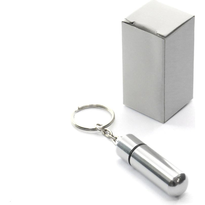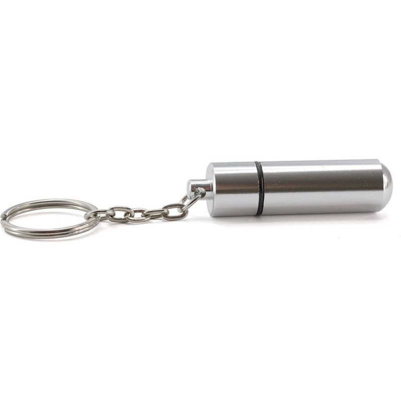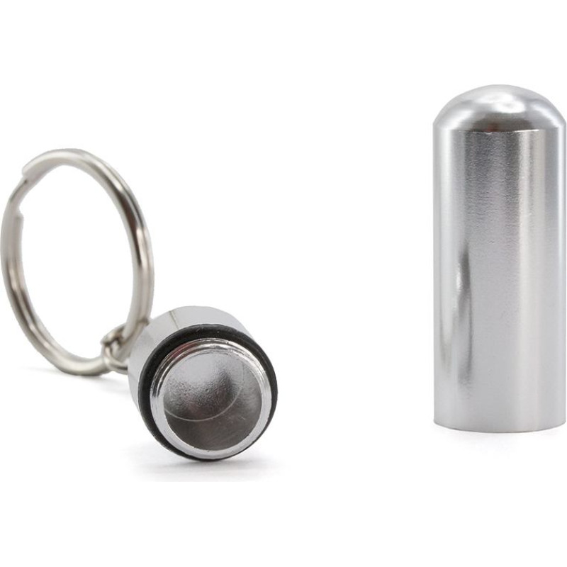 Discreetly designed pill case keychain with aluminum body, in glossy finish and with screw-on lock.