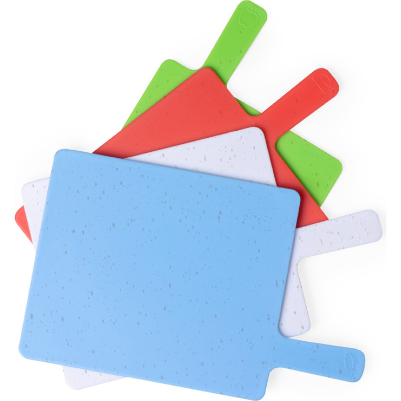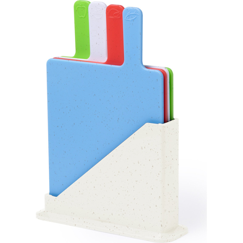 Board set made of resistant PP. Including four boards, with a holder for a tidy storage. Each board is easily recognisable by the engraved patterns and different colours, for different types of food. Presented in a kraft design box.