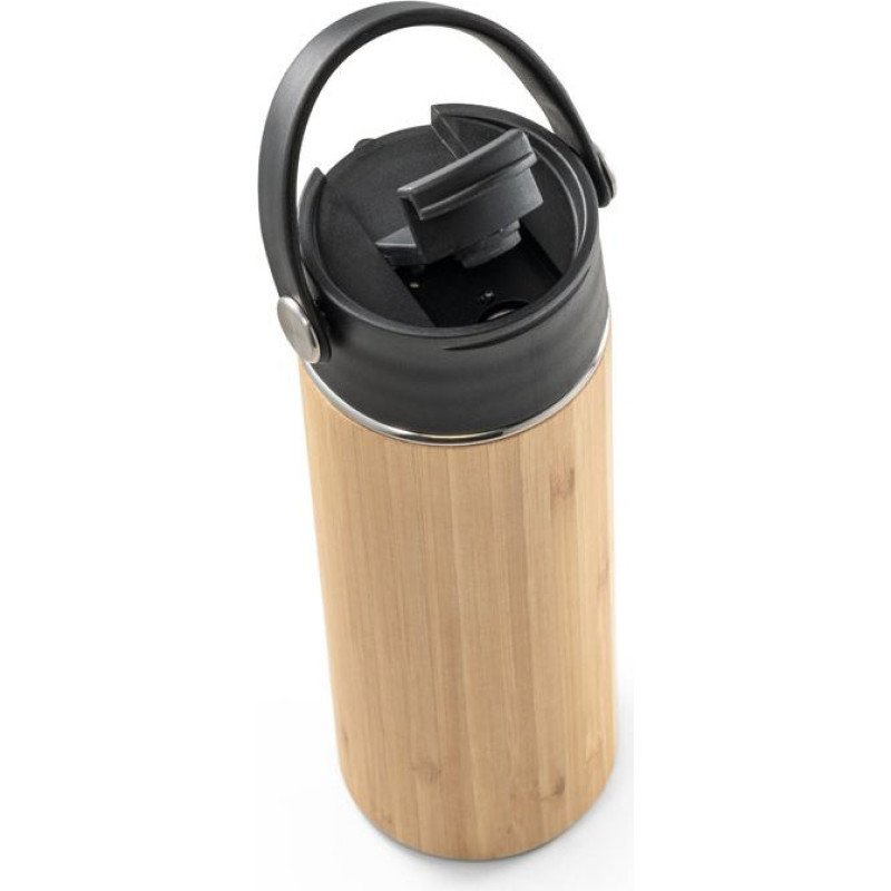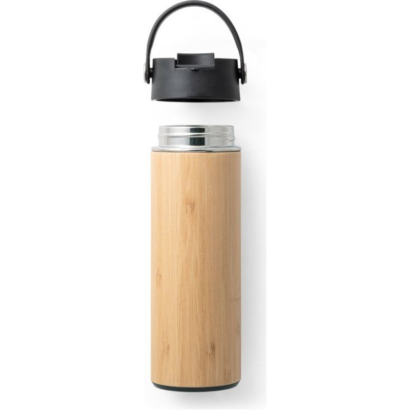 Bamboo and stainless steel bottle with a PP lid, double-walled body and vacuum insulation. Capacity of up to 440ml. Supplied in a kraft paper gift box. As the product is made from natural materials, the colour and the printing result may vary between products. ø70 x 222 mm