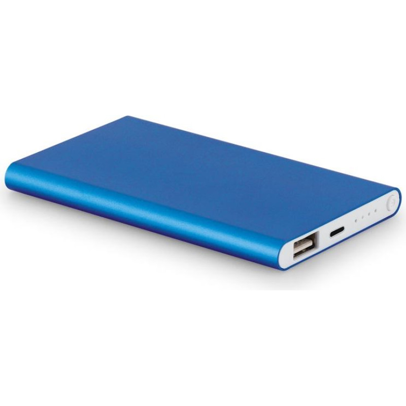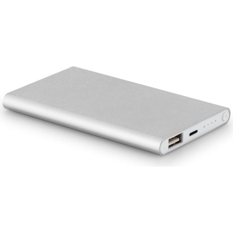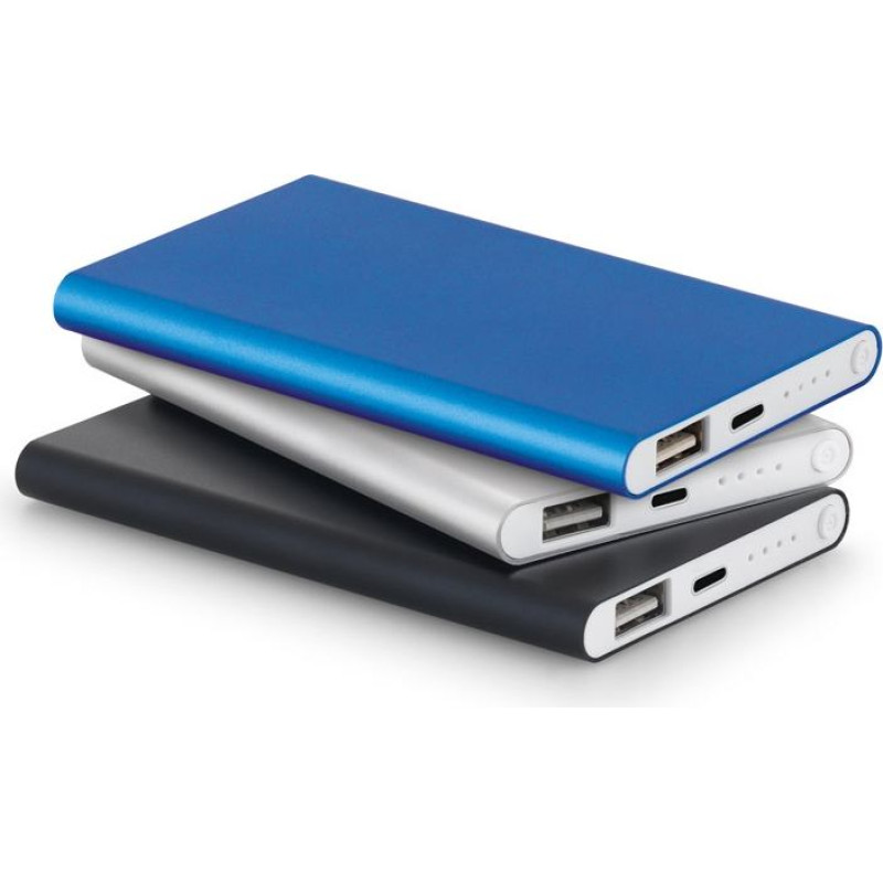 Power bank in recycled aluminium (100% rAL) and recycled ABS (100% rABS), with slim design. Portable battery with 4.000 mAh capacity, charge level indicator, one USB-C input and one USB-A output. Includes a USB-C charging cable. Supplied in a recycled kraft paper gift box. 110 x 68 x 10 mm | Box: 95 x 116 x 17 mm
