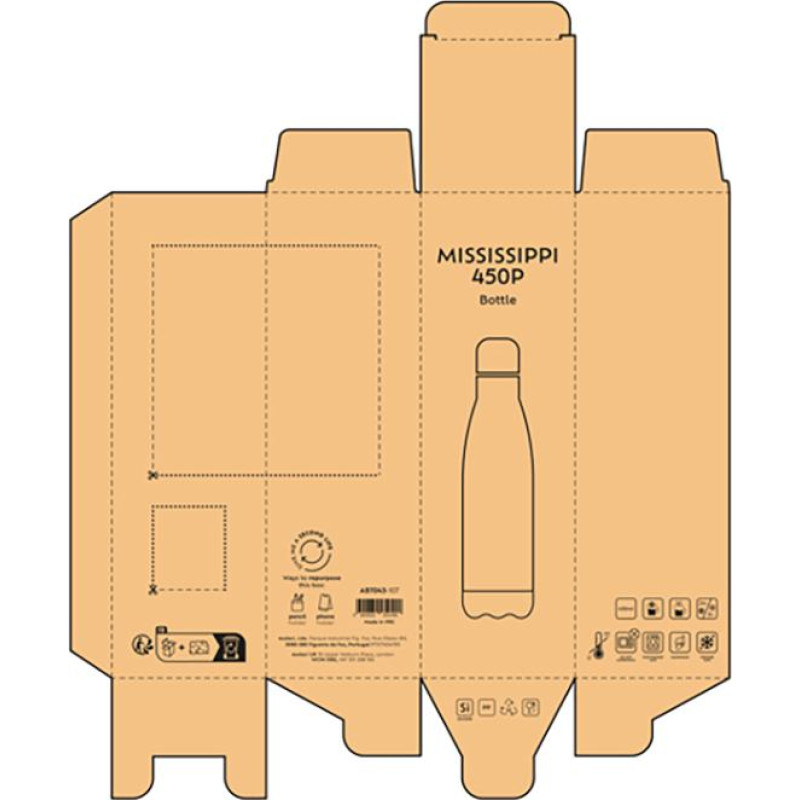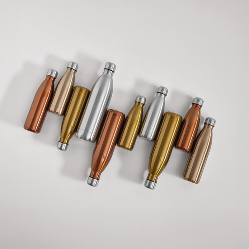 Mississippi 450P bottle 430 ml (400ml net)made from recycled stainless steel and with a luxury shiny metallic finish. The double walled insulation will keep your drinks hot for 14 hours and cold for 48 hours. It’s leakproof and dishwasher-proof. An attractive accessory to help you stay hydrated. Available in 4 metallic colours, Gold, Rose Gold, Silver and Bronze all in 4 different capacities. Supplied in an eco-friendly individual kraft box.