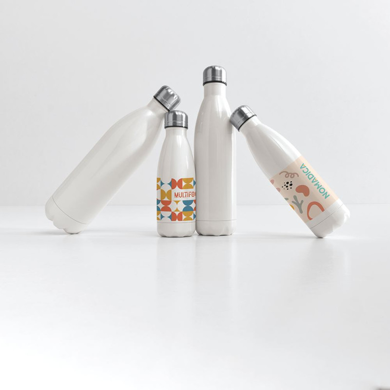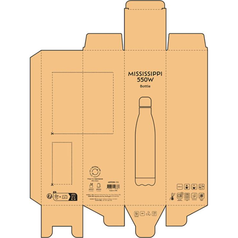 Mississippi 550W sublimation bottle 535ml capacity (500 ml net) made from recycled stainless-steel. The double walled insulation will keep your drinks hot for 14hours and cold for 48 hours. It’s leakproof and dishwasher-proof. An attractive accessory to help you stay hydrated. Available in 4 different capacities. Designed specifically for a full colour sublimation print. Supplied in an eco-friendly individual kraft box.
