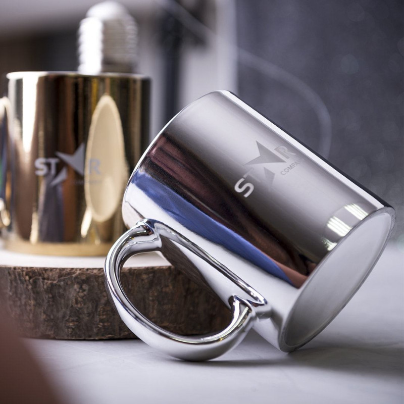 350ml ceramic mug. Available in eye catching colors silver and golden. Especially designed for laser engraving, including a special metallic coating for your logo to be properly engraved in white color, matching with the inside color of the mug. Presented in an individual box. Use in microwave ovens is not recommended due to the metallic outer coating.