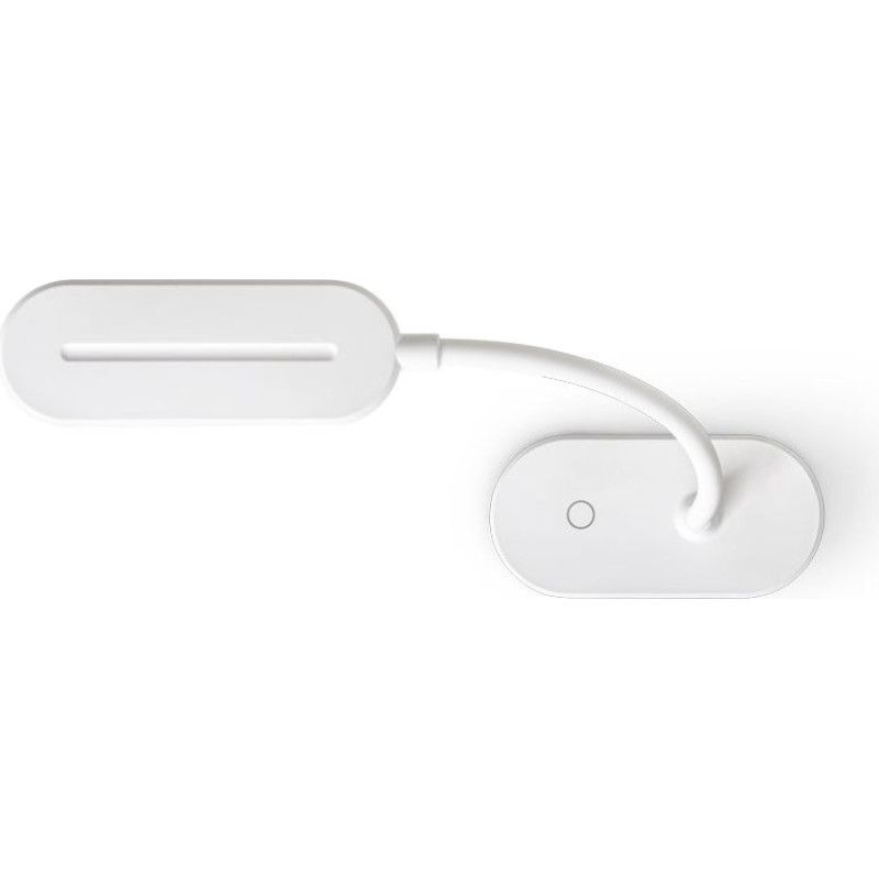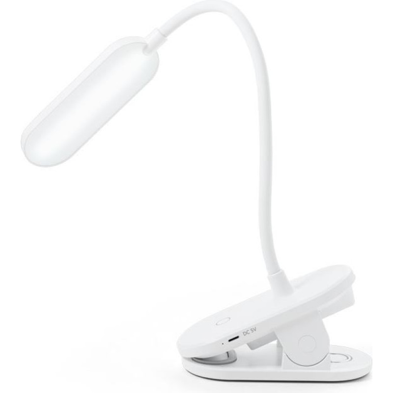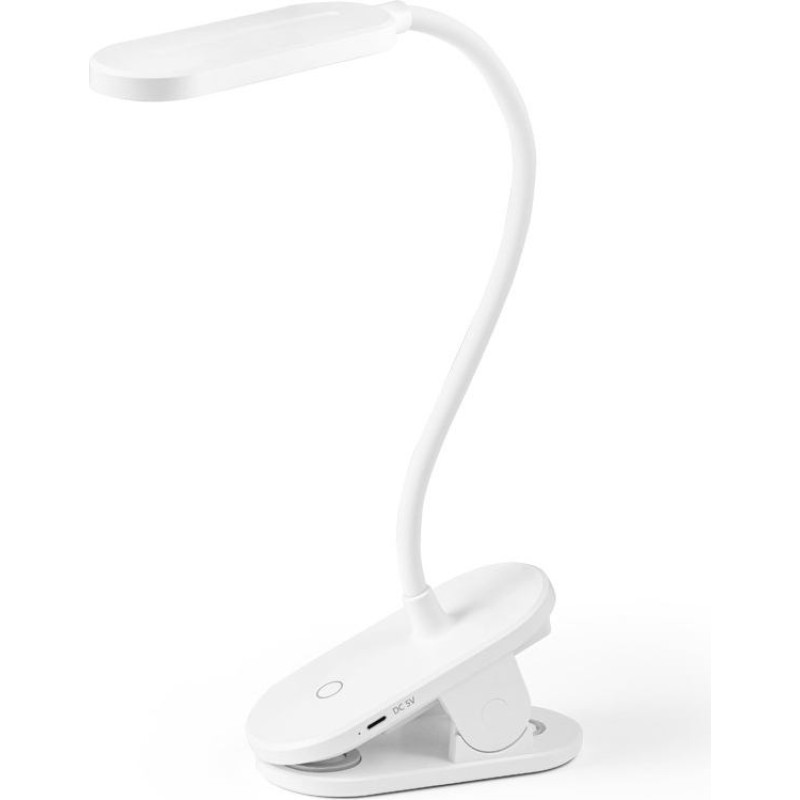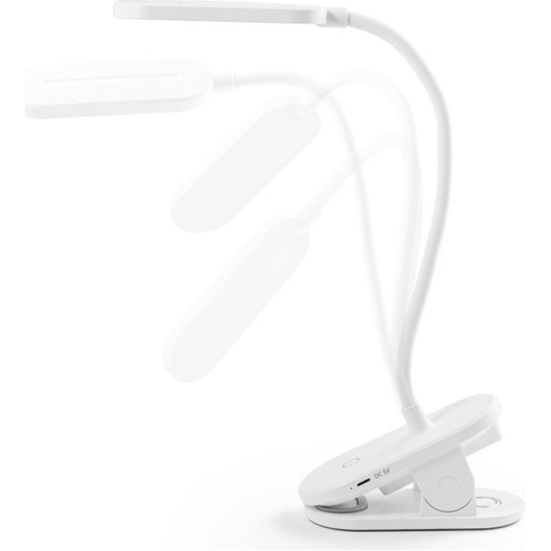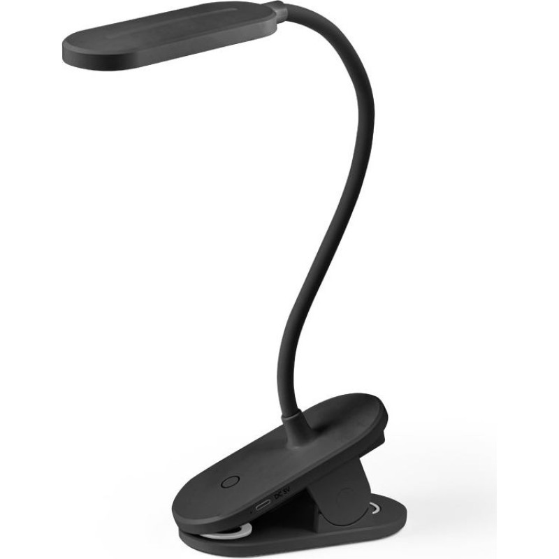 Portable desk lamp with 140 lumens and clip for attaching to surfaces. The base is non-slip and the 360° flexible tube allows you to easily adjust the direction of the light. It has an on/off switch and 3 brightness levels, providing approximately 30 hours of battery life in low light mode, 7 hours in medium light mode and 3 hours in high light mode.Material: ABS (65% recycled) | Capacity: 1.200 mAh | Includes: USB-C charging cable | Supply: kraft paper gift box 122 x 58 x 456 mm
