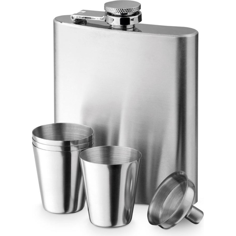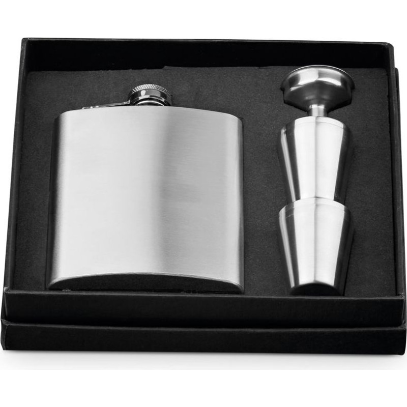 Set with stainless steel hip flask with volume-capacity 200 mL includes, funnel and 4 cups. Cup capacity 20 mL. Supplied in a gift box. 189 x 40 x 168 mm