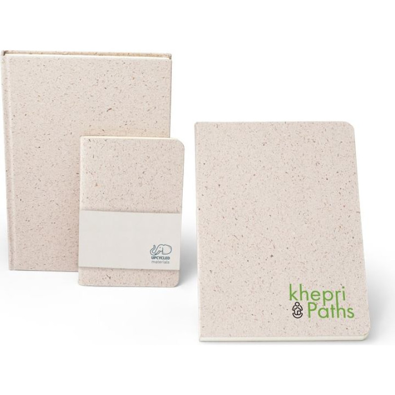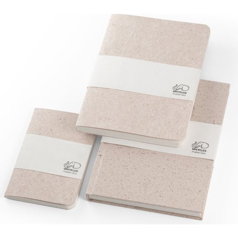A5 notepad with semi-rigid cover made from organic elephant matter (80%) and cotton waste (20%). The inner paper is made from cotton waste (100%) and is highly durable. Contains 100 lined pages and paper band with artwork. No waste has been generated nor have any chemicals or trees been used in the manufacturing process of this notepad. As the product is made from natural materials, the colour and the printing result may vary between products. 140 x 200 mm