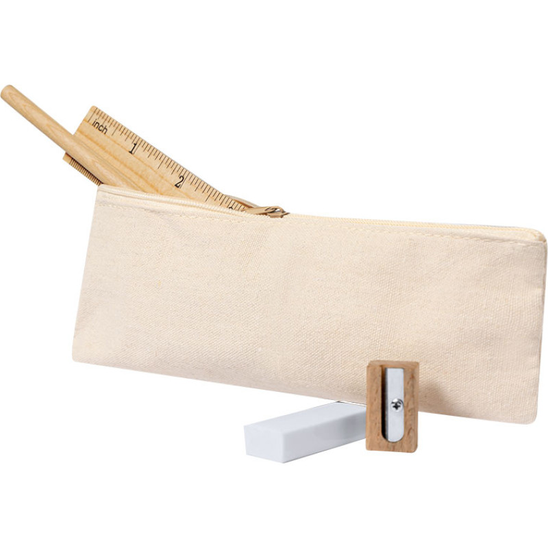 Set of 4 pieces presented in a cotton case with zipper closure. Includes: - Wooden pencil with a round natural finish and black lead - 15cm ruler with metric system in centimeters/inches - Eraser - Sharpener