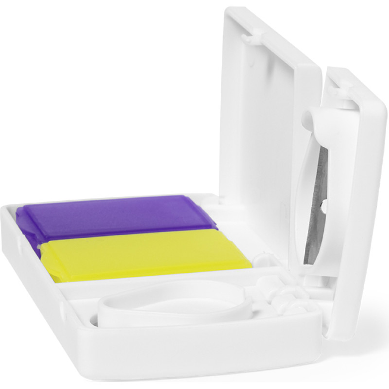Pill box in soft and resistant material in white. With 2 inside boxes, safety lock and blade to split pills.