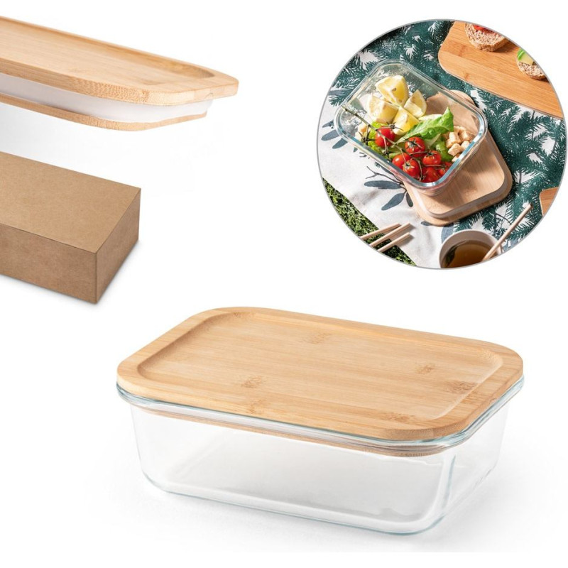 Hermetic box in borosilicate glass and bamboo lid with silicone sealant. Suitable for microwave and dishwasher use, when lid is removed. Supplied in a kraft paper gift box. As the product is made from natural materials, the colour and the printing result may vary between products. 196 x 145 x 64 mm | Box: 202 x 150 x 66 mm