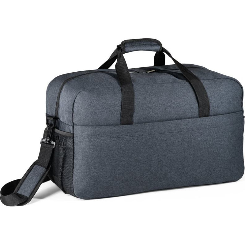 600D recycled polyester sports bag with inner linning and semirigid board on the bottom. Main compartment and frontal pocket with zipper and two side pockets, one in mesh and the other with zipper. The bag has detachable and adjustable webbing padded shoulder strap and handles with reinforcement. Capacity up to 31 L. 500 x 300 x 230 mm