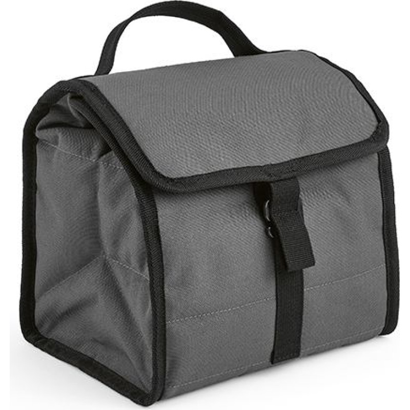 Reykjavik rPET cooler (9L), with sleek black handles and trim. The fabric is derived from recycled materials. The roll-top closure ensures easy access, while the top handle adds portability. Secured with a metal G hook closure, this bag offers a sturdy and stylish fastening solution that’s easy to use and built to last. Suitable for 9 cans.