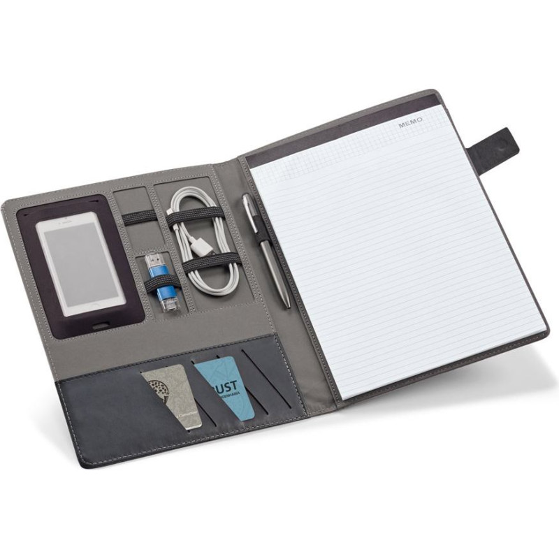 A4 imitation linen and PU folder . Features a magnetic closure with a customisable plate, a 40 lined pages pad with lined paper, pen holder (pen not included), smartphone pocket and brackets for cables or other accessories (not included). 233 x 310 x 18 mm | Plate: 50 x 30 mm