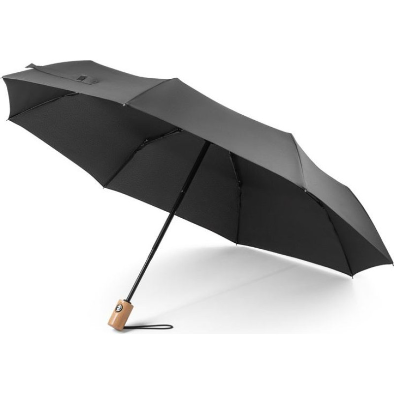 190T recycled polyester (100% rPET) pongee umbrella, with fibreglass ribs and wooden handle. Foldable umbrella in 3 sections, with automatic opening and closing and windproof. Supplied in bag. Umbrella: ø990 x 285 mm | Bag: ø55 x 240 mm