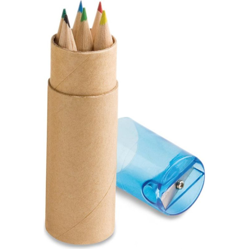 Cylindrical sharpening box with 6 wooden colouring pencils. Includes a colorful lid with sharpener. ø26 x 106 mm
