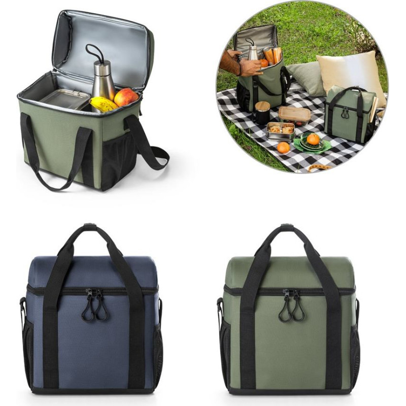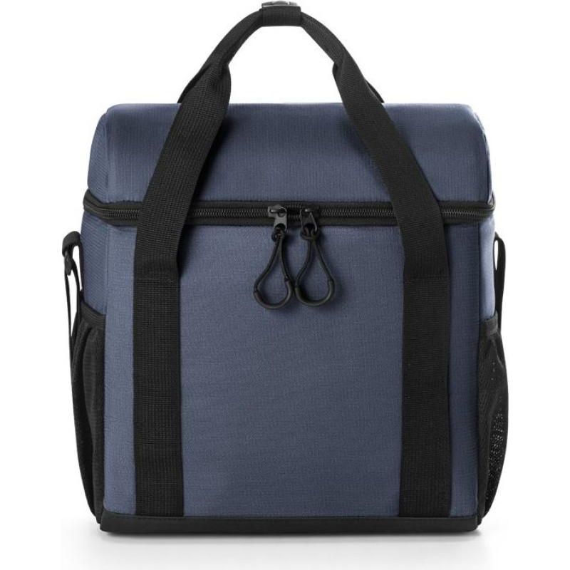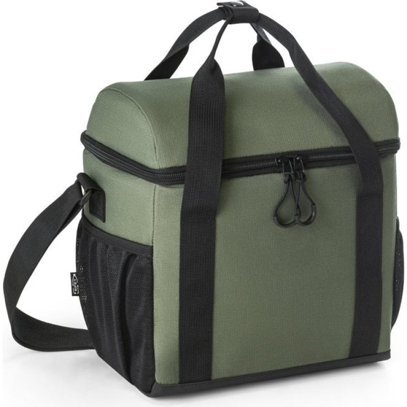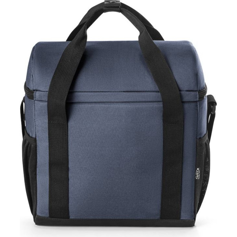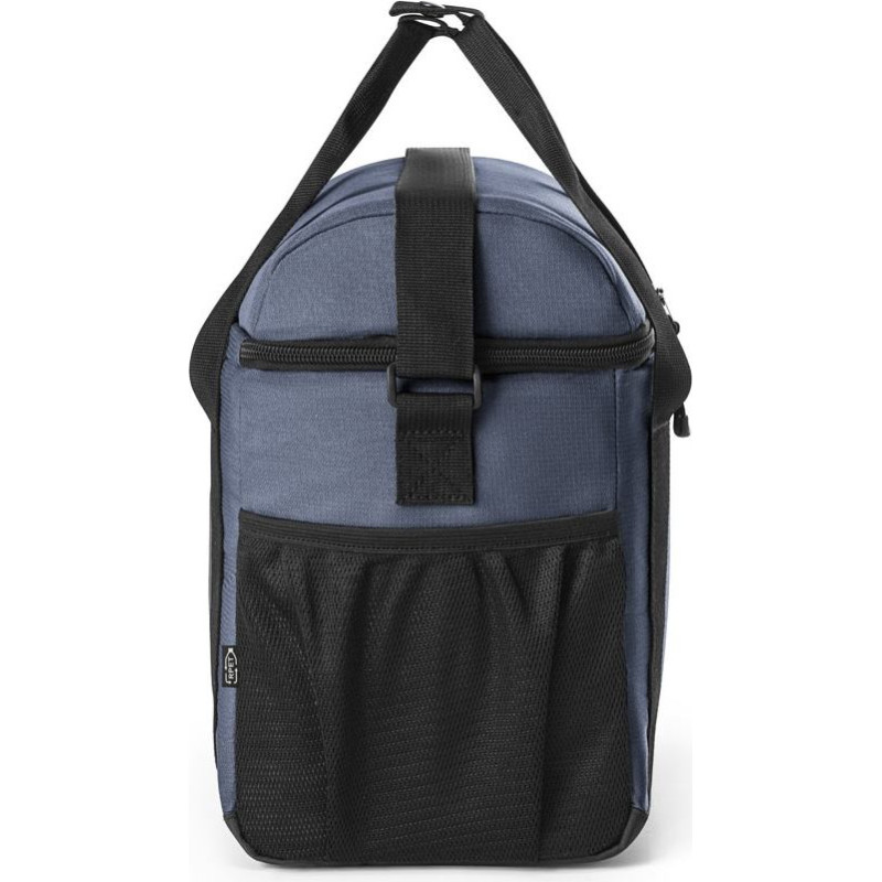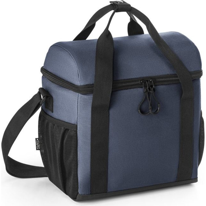 Padded cooler bag in recycled polyester 600D ripstop. Composed of 1 large main compartment with double zip fastening on both sides and 2 side mesh pockets for small items. The PEVA-lined interior ensures good thermal insulation, allowing the cold to be kept in for longer and sanitised. The robust materials give it strength and durability, designed for everyday needs. Capacity up to 11 L. 260 x 290 x 160 mm