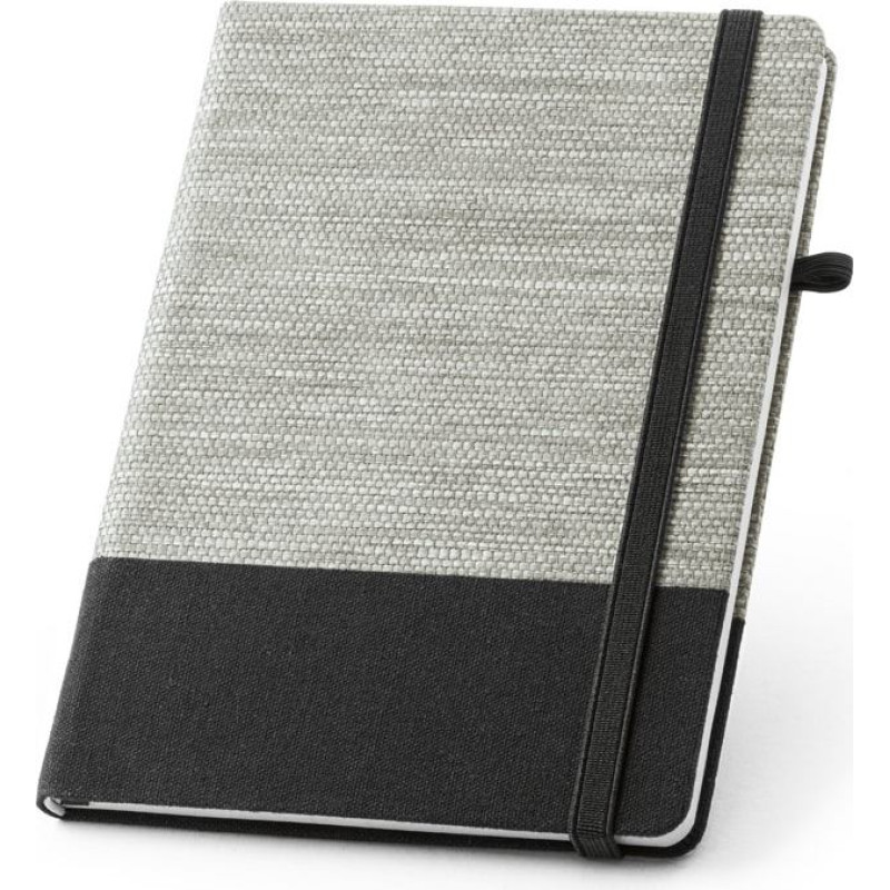 A5 notepad with hardcover and rounded corners made from natural straw fibres and cotton canvas. This notepad has 192 lined white pages, bookmark ribbon, elastic band and pen holder (pen not included). 150 x 210 mm