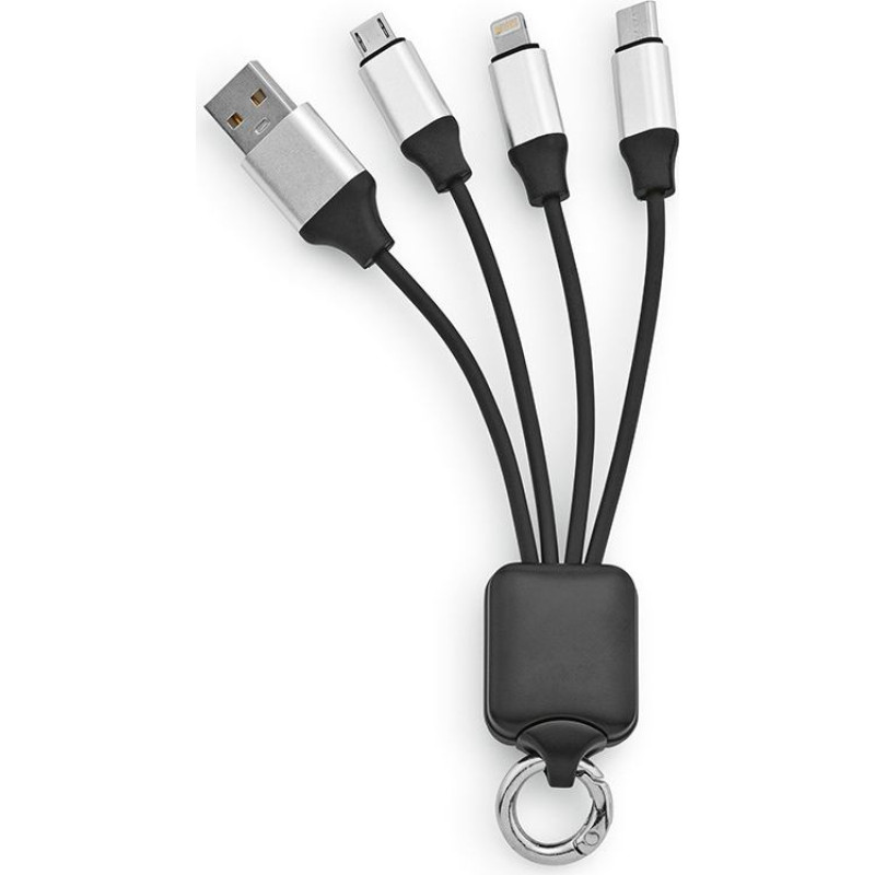 Sagan 4 in 1 multi charging cable in rTPR. Featuring USB-A, USB-C, Micro USB and Lightning (12W / 5V2.4A). This cable easily holds all of your daily tech and lifestyle necessities, thanks to its smart design and system of functional outputs (4 in 1). Includes a hanging loop and comes packed inside an individual kraft pouch.